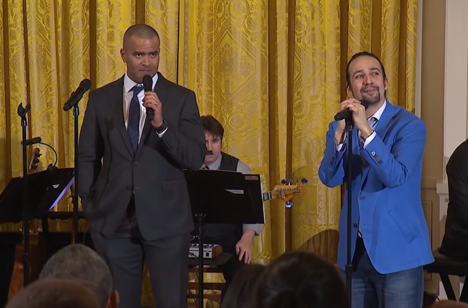 Here were some people listening in the front row that evening. Seven years later, Joe Biden could reflect on the event and the song. (Screenshots from Hamilton YouTube channel.)