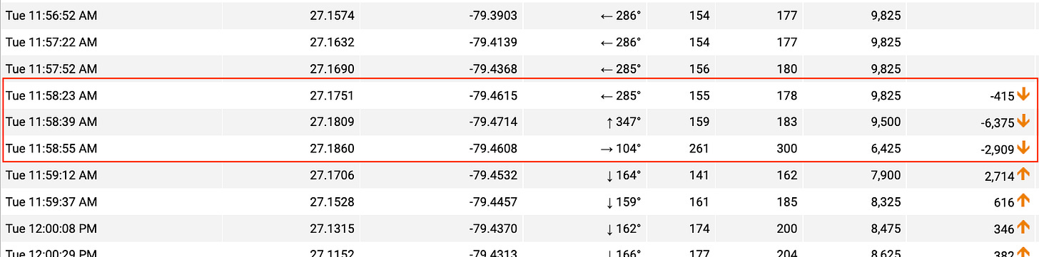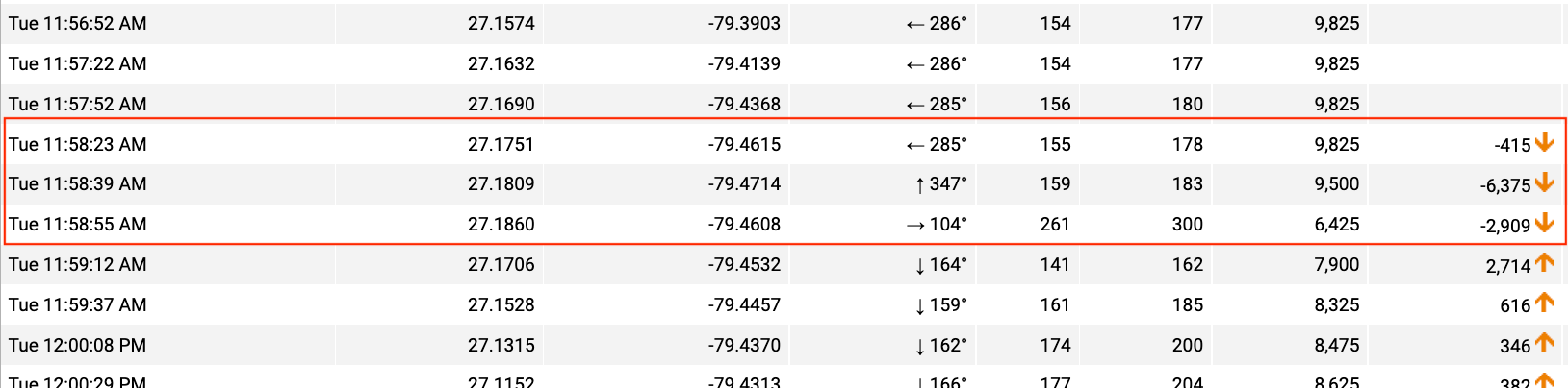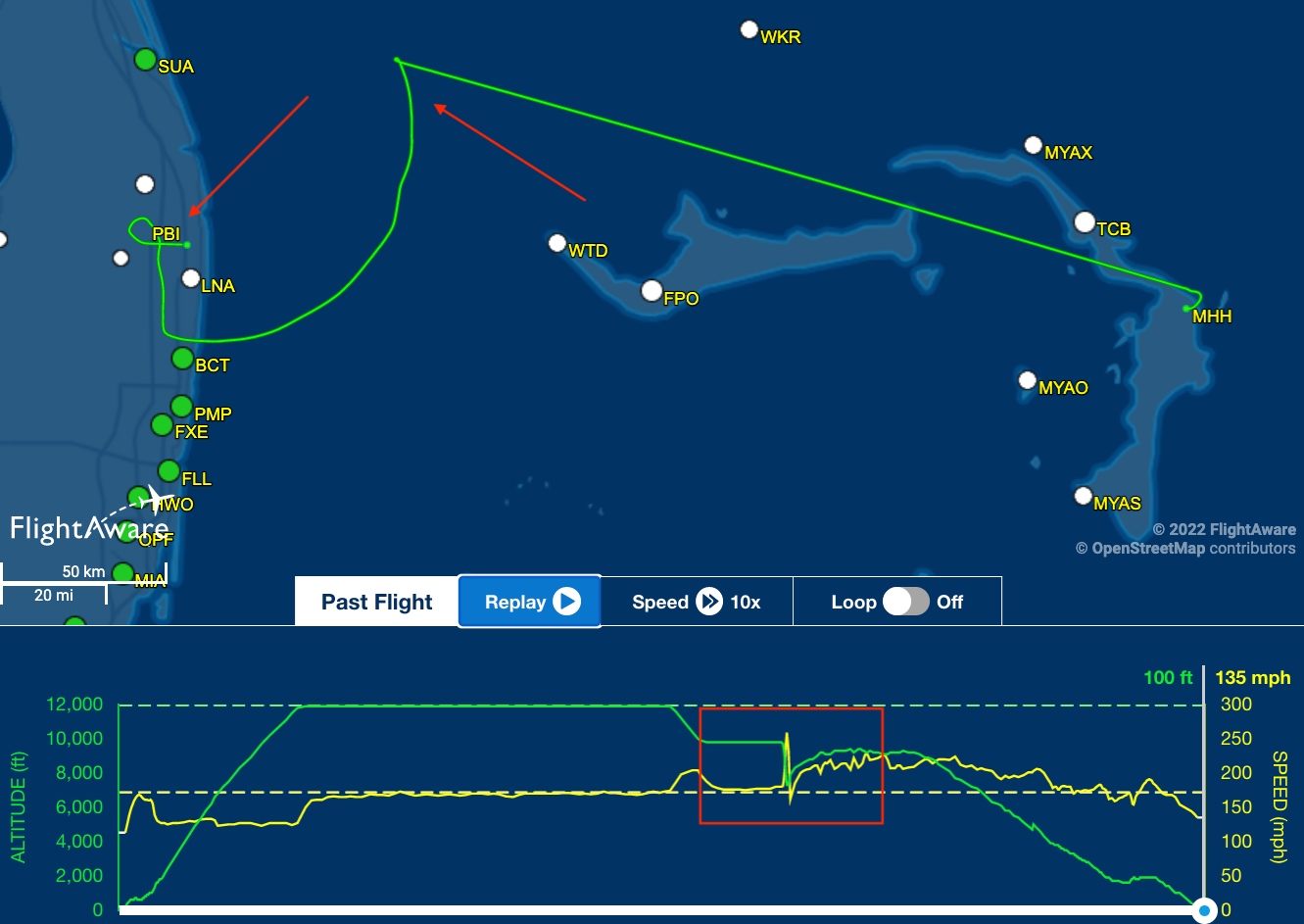 The FlightAware path shows several distinctive things. I’ve highlighted some in red. On the right, the moment when the regular pilot passed out. On the left, the approach-to-landing at Palm Beach airport. And at the bottom, a graph of the speed-and-altitude anomalies.