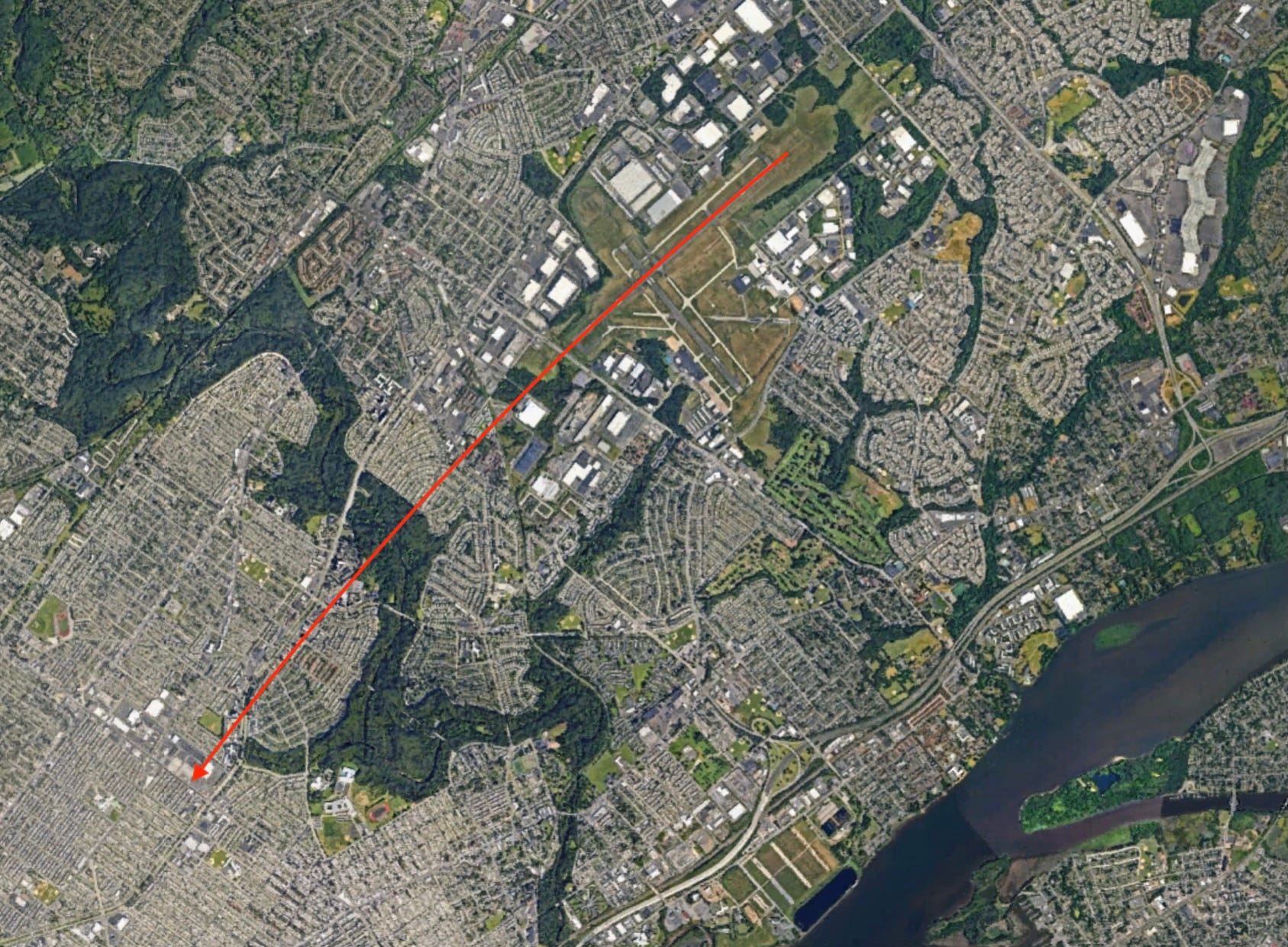 Here’s the general idea of what we’re talking about, from an annotated screenshot on Google Earth. The red arrow shows the plane’s takeoff route, starting in the upper right corner and following PNE’s Runway 24 toward the southwest. The arrow then leads to its impact point, less than 3 miles away.