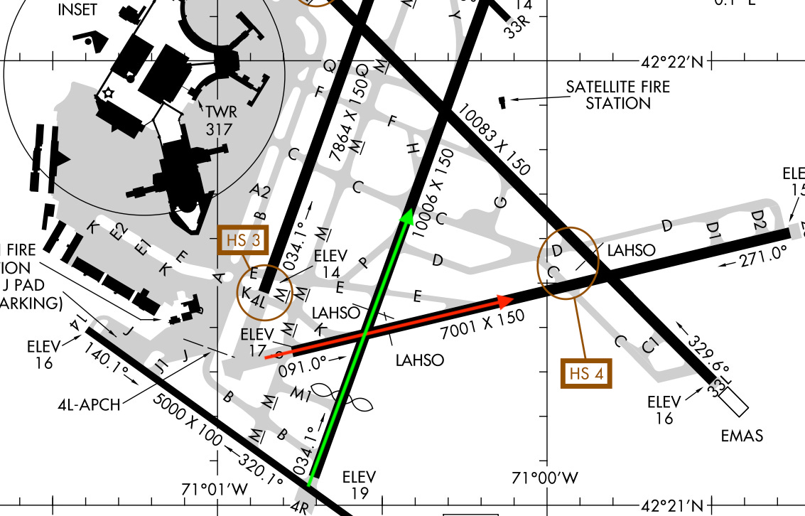 Here is what she means. The Learjet’s path along Runway 9 is shown in red. But a JetBlue plane has already been cleared for landing on Runway 4 Right, as shown in green. The two paths intersect.