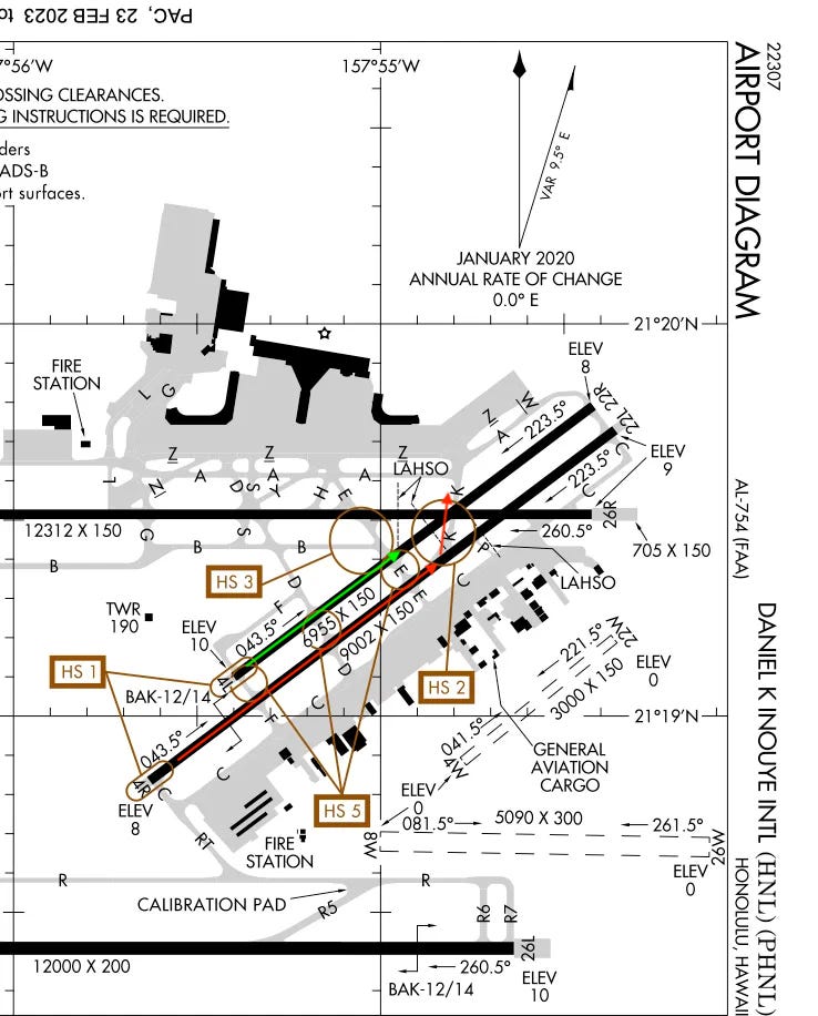 In brief: the Inouye airport at Honolulu includes two parallel runways, 4 Left and 4 Right. A small turboprop cargo plane was cleared to land on 4L, the shorter runway. That’s shown in green. Meanwhile a big United 777 was cleared to land on 4R, as shown in red. This kind of “parallel runway” operation is routine.