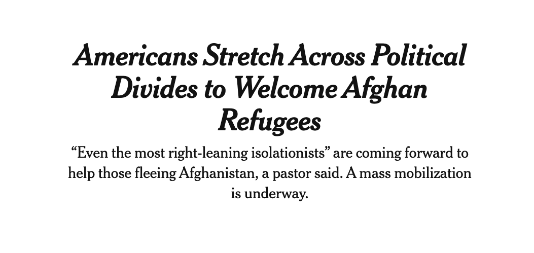 For the moment, let’s set aside the obvious complications and caveats: Who exactly made it out of Afghanistan, and didn’t. When and where the inevitable glitches and oversights in the resettlement process will first show up. Whether and where either a “genuine” local backlash against new arrivals might appear, or a politicized, “Stephen Miller-style” movement might be ginned up.