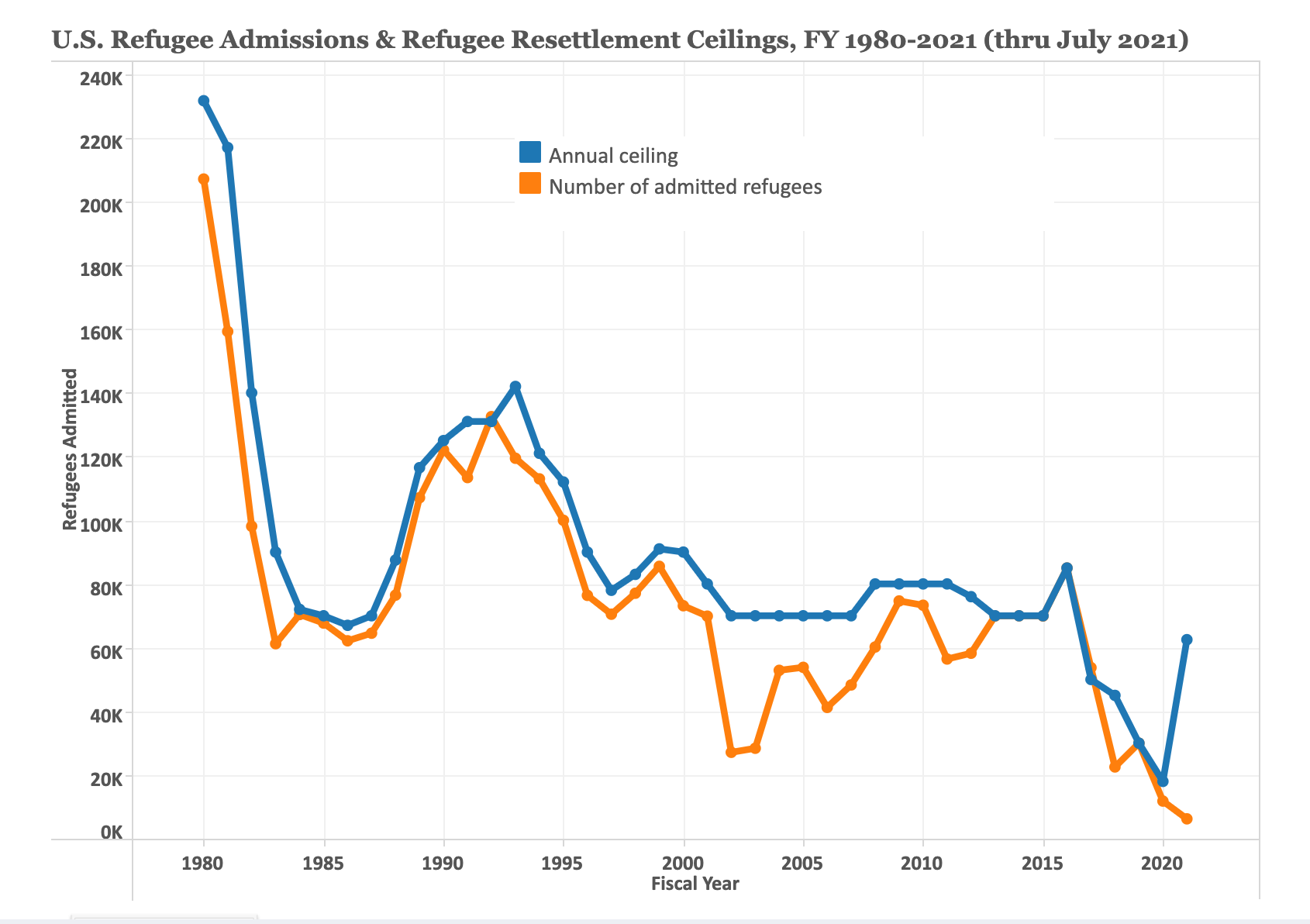 The blue line shows the legal ceiling that presidents set for annual arrivals; the orange line shows how many people actually came in.