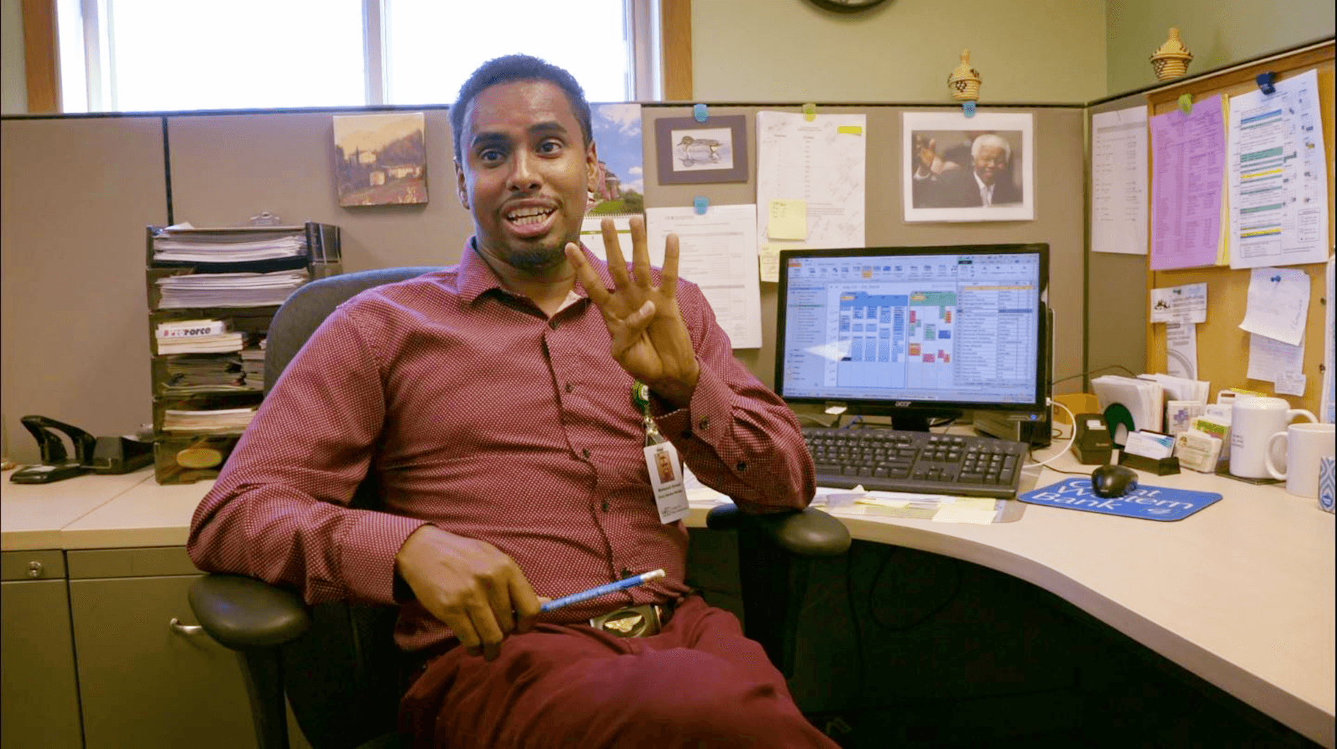 One of the most powerful scenes in our HBO film Our Towns is in the Lutheran Social Services office in Sioux Falls. There Mohamed Ahmed, who had arrived as a refugee from Somalia and is now a medical consultant for newer refugees, tells his story.