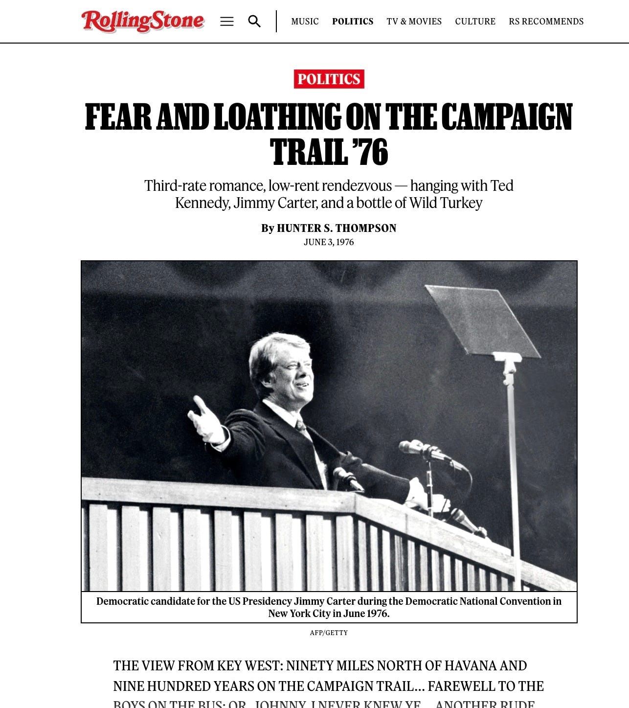 More and more I believe that if Thompson had not been there to follow Kennedy, had not stayed an extra day, and had not gone on to declare Carter’s remarks a “king hell bastard of a speech,” Jimmy Carter would never have gotten traction in the Democratic primaries nor ended up in the White House. (Modern comparison: people talking about how Joe Rogan sealed the deal this time for Donald Trump.) Here is how the historian Sean Wilentz recently put it, also in Rolling Stone: