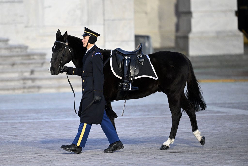 With boots facing backwards, a riderless horse as part of Jimmy Carter’s state funeral observations in an Arctic-seeming Washington DC this week. (Photo by Mandel Ngan/AFP via Getty Images.)