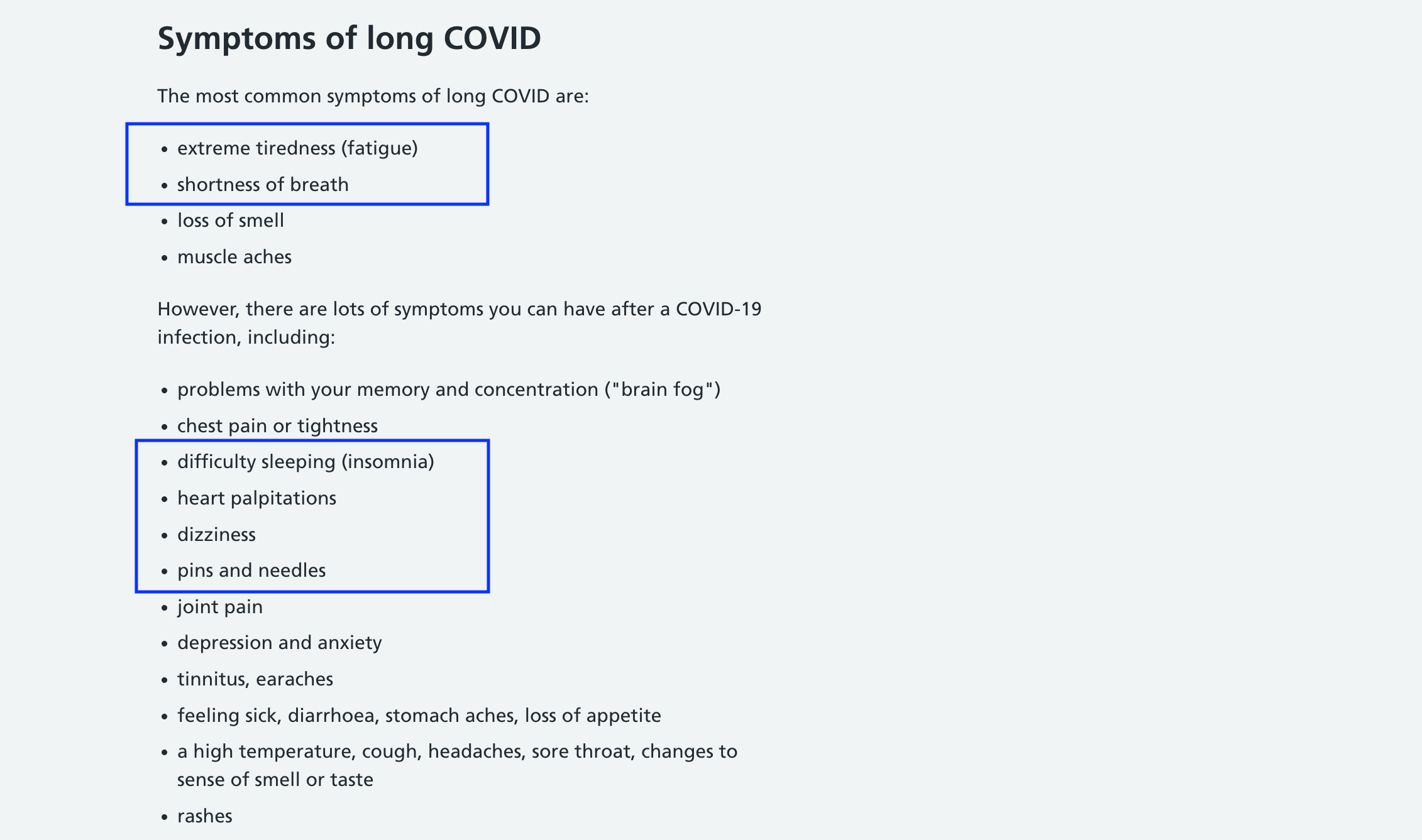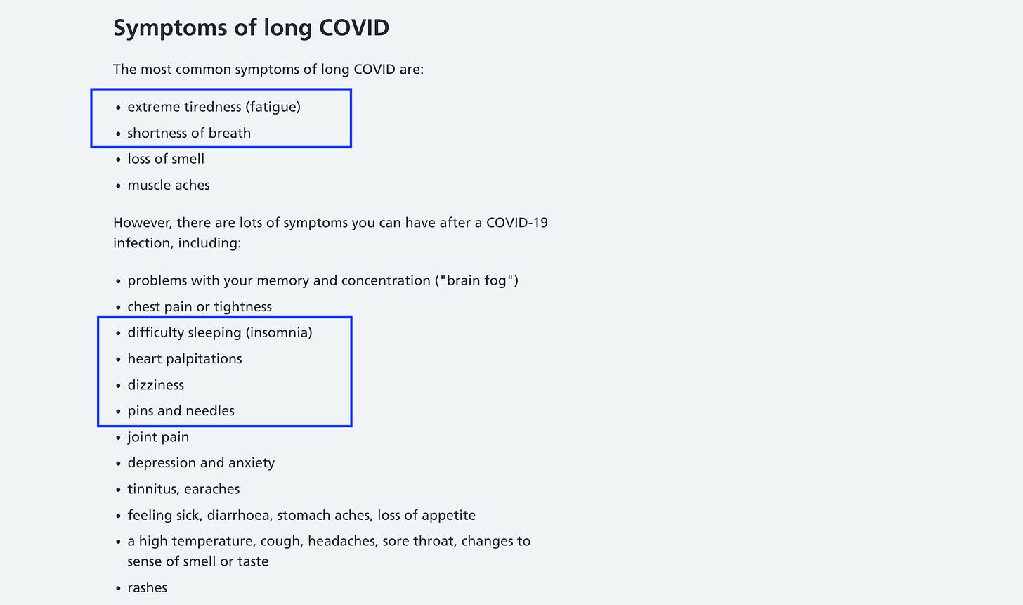 So I’ll just describe a set of symptoms that I hadn’t noticed before my seemingly mild Covid encounter, but that I’ve noticed since. The list below, which does use the “long Covid” name, is from the National Health Service in the UK. What I noticed is that I don’t have anywhere near all the problems they itemize. But every problem I did have, shown in highlights, is on their list. (I never had the taste/smell issues, or others they include.)
