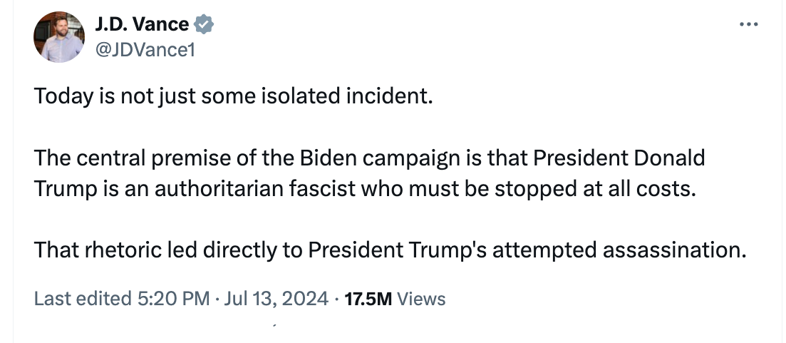 But what the Trump attack will ultimately “mean” absolutely no one can say at the moment. (Also what no one knows: What kind of injury, exactly, Donald Trump suffered, since there has been no medical briefing whatsoever.) Not the NYT columnist who within two days of the shooting confidently declared3 that Trump’s survival marked him as “a man of destiny.” And certainly not the newly prominent JD Vance. Who within hours of the shooting, before any information had emerged about the killer, announced this to the world: