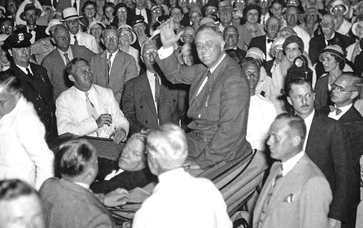 On February 15, 1933, a few weeks before his first swearing-in as president, Franklin D. Roosevelt greeted a crowd in Miami from the back of an open car. Moments after this photo was taken, an assassin with a pistol began firing from almost as close as this photographer was.