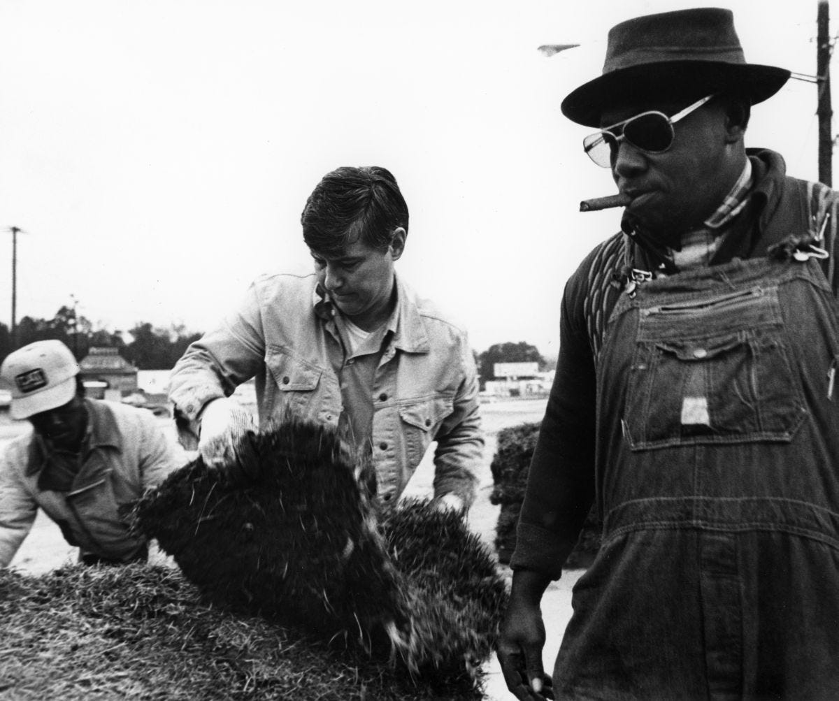 Bob Graham, while in office as governor, handling sod with crew members identified as Willie Lee Rasberry (left) and Samuel DeLoach at a road-widening project in Tallahassee.