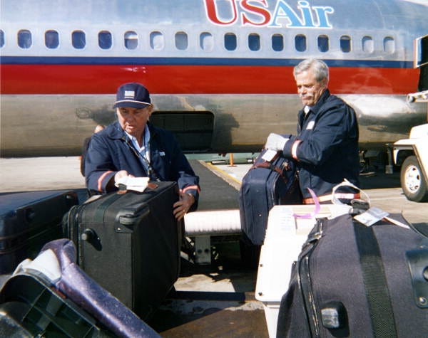 US Senator Bob Graham (in cap), then age 64, during his day as a baggage handler for USAir.