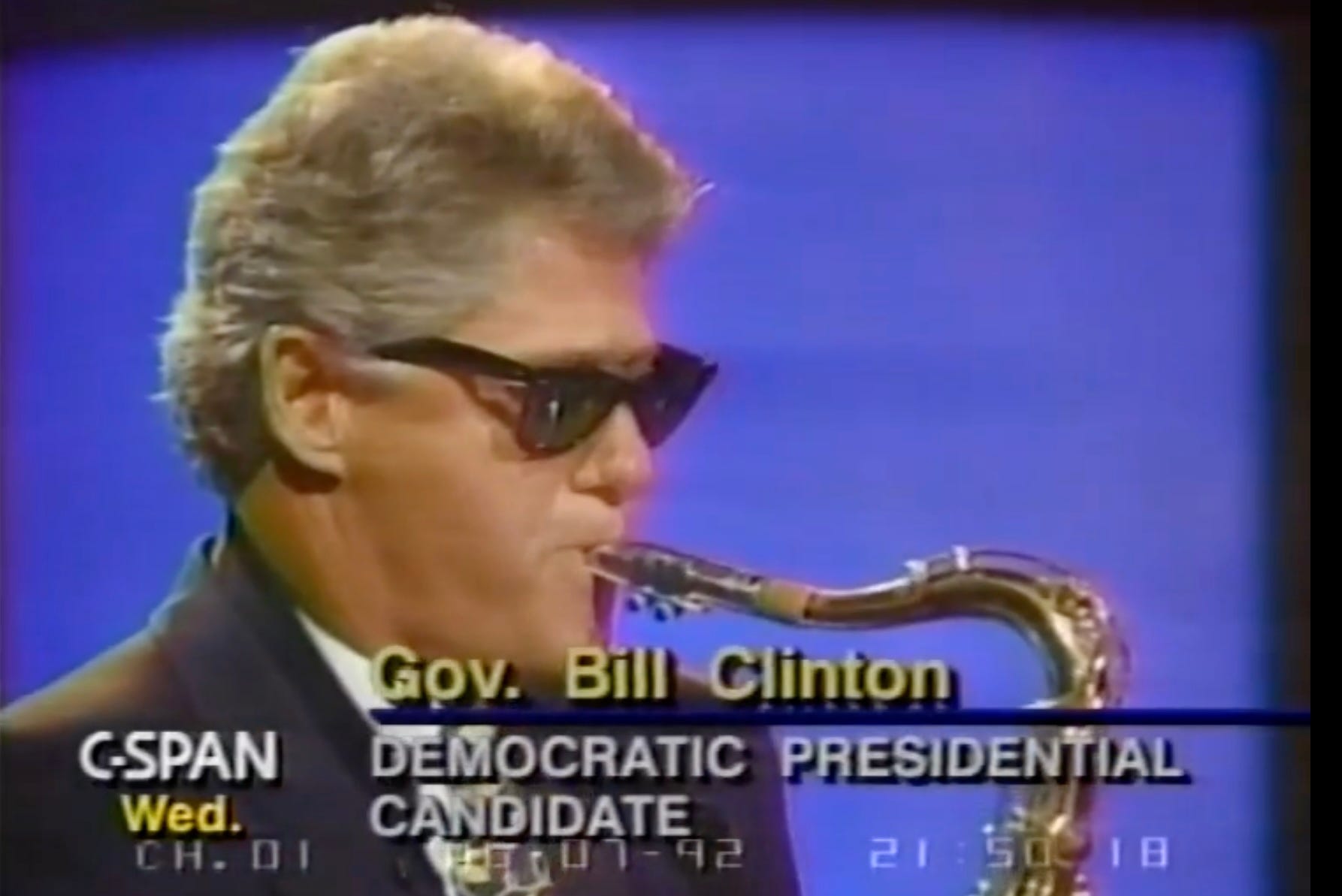 In early June, 1992, five months before the election, the young governor of Arkansas, Bill Clinton, was a distant third place in presidential polling, behind incumbent George HW Bush and independent Ross Perot. Part of Clinton’s comeback involved end-running traditional media coverage, with appearances like this saxophone-playing spot on the then-popular Arsenio Hall TV talk show. (Screen shot from C-Span.)