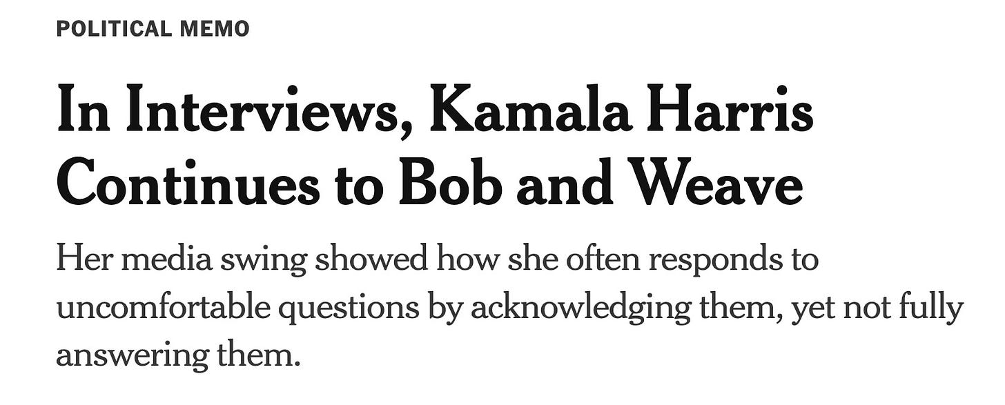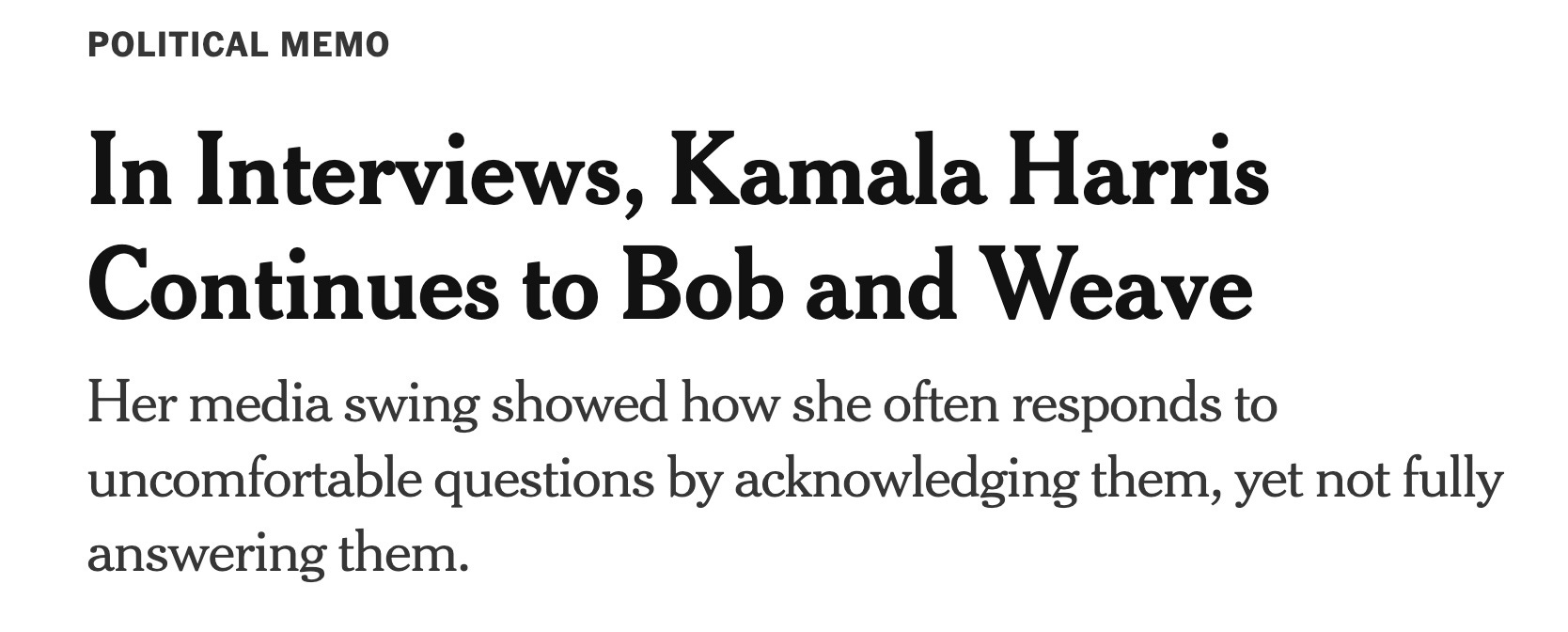 But anyone who happened to read beyond the headline would have a big surprise in store. That is because the article presents the bob-and-weave—more formally, “giving the answer you want to give, whether or not it’s the question you were asked”—less as a failing than as a time-honored political skill. Indeed, the article as a whole is quite respectful of Harris as an interviewee. For instance:
