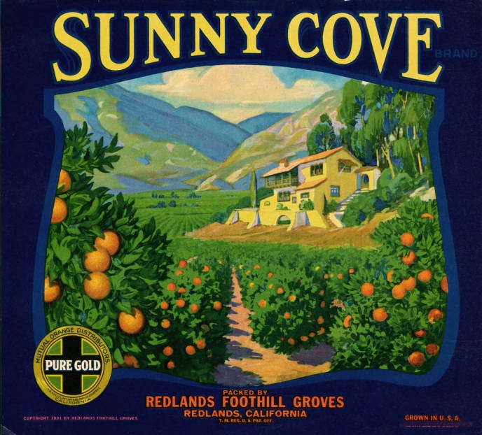 More hometown orange-crate art, from the two-decade period of the 1920s and 1930s in which California’s population doubled, as people moved in to get a new start. (LA Public Library collection.)