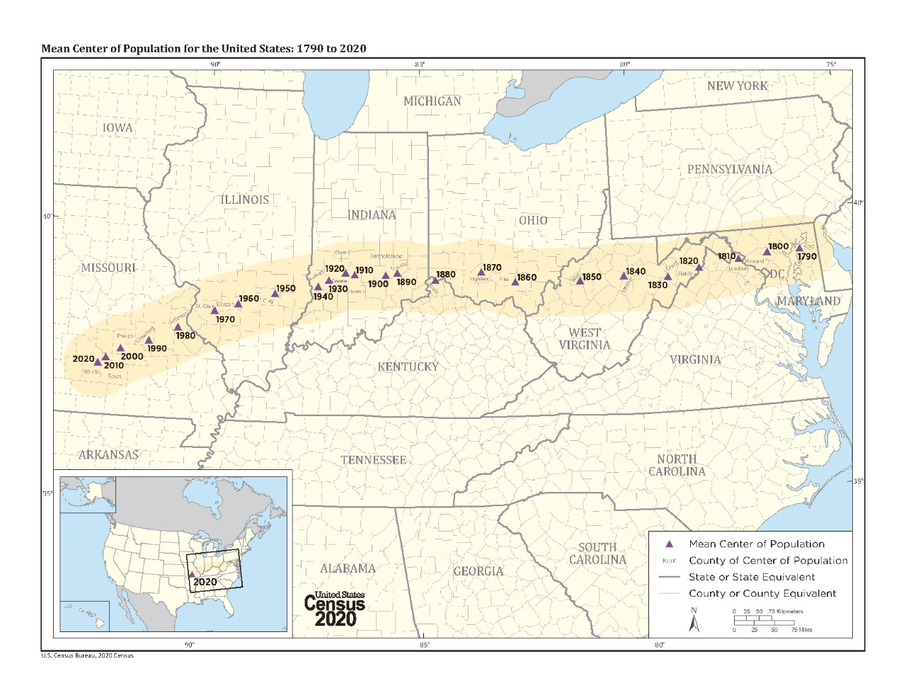 From the Census Bureau, decade-by-decade track of the geographic center of US population, from 1790, when it was just east of Baltimore, to 2020, in southern Missouri.