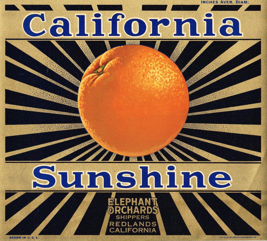 A 1930s packing house label from a long-defunct operation in the small town where I grew up, and where my first job was in the orange groves. The prospects of better weather, better possibilities, and a new start were all part of what drew my parents from the East Coast to California during the great post-World War II migration. Several new reports show how the politics-of-place is changing now. (From the Huntington Library, via the wonderful Fruit Crate Labels collection at the Los Angeles Public Library.)