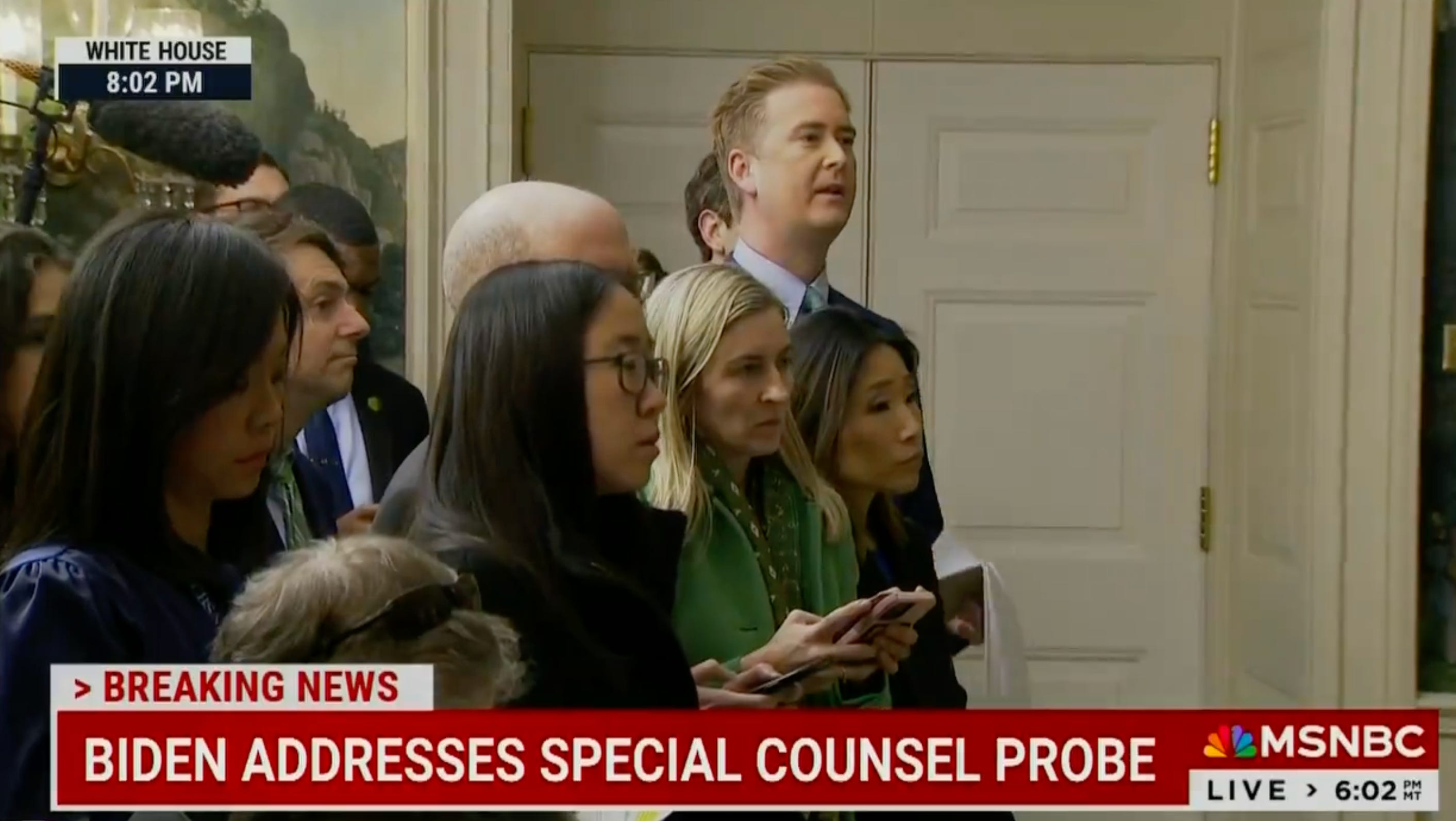 A calm moment in yesterday’s impromptu press conference at the White House. A few moments after this, virtually all reporters in the press room were screaming questions at Biden all at once. Biden took the first question from Peter Doocy, of Fox (at rear), who asked whether Biden was in cognitive decline. (Screenshot from MSNBC.)