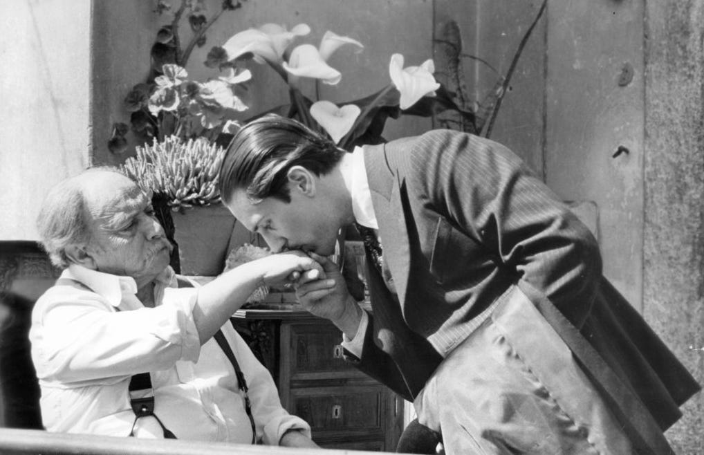 A young Robert DeNiro, as the young Vito Corleone, kissing the ring of then-boss Don Francesco in Godfather Part II. That film came out 50 years ago. The rituals are timeless. (Getty Images.)