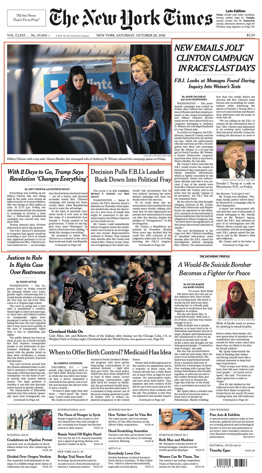 The front page of the New York Times on October 29, 2016. (Red highlighting added, by me.)
