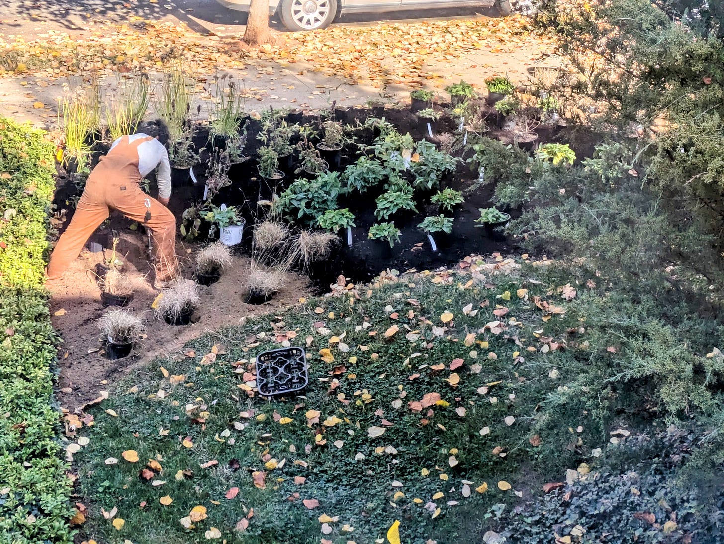Replanting, for a new beginning. A team working on “re-wilding” our front lawn in Washington DC, on this warm and beautiful November morning the day after the election. (Photo by Deborah Fallows.)