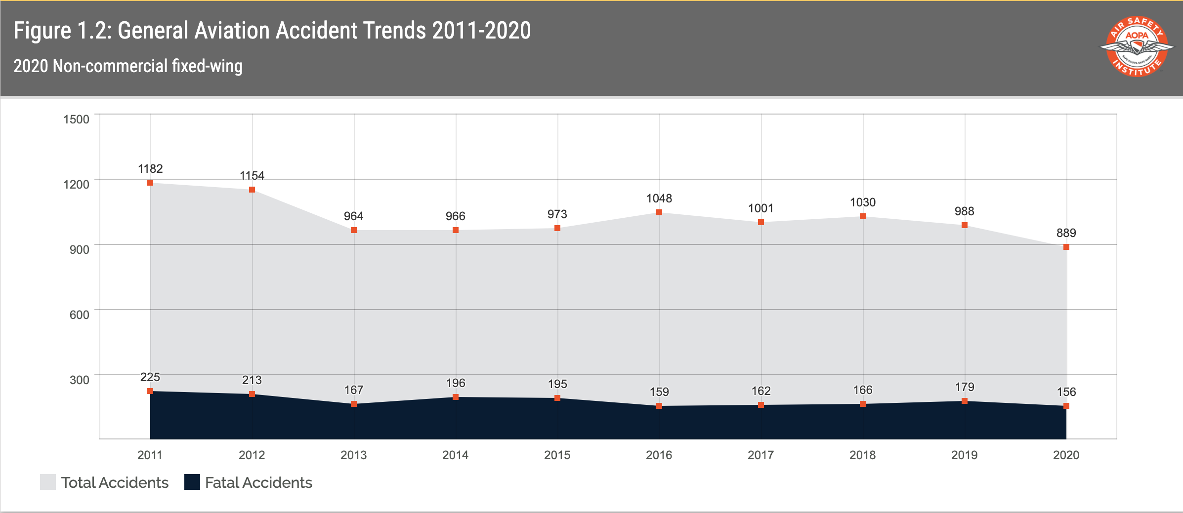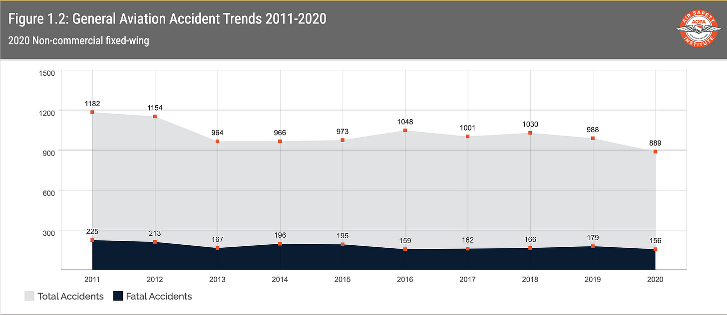 For now I’ll just point you toward the canonical source on all questions of safety in general aviation, the “Nall Report” from AOPA Air Safety Institute. Here is a sample of the overall trend. What it shows, in brief, is that across the country there are an average of two-plus “accidents” per days in non-airline aviation. And on average, one person dies every-other-day in these incidents. (For comparison, about 100 people die every day in car crashes in the US, but of course there are many more drivers than pilots.)