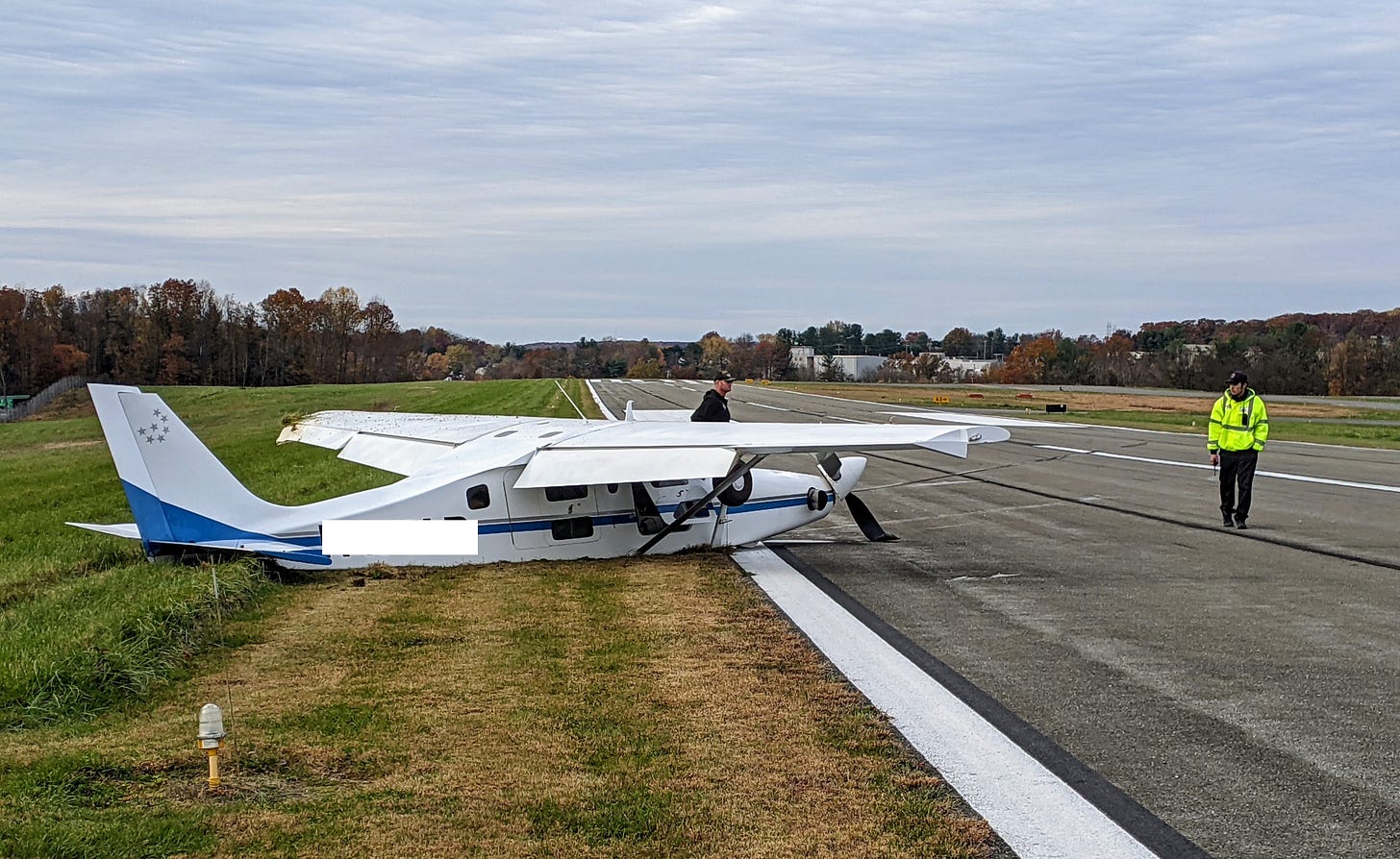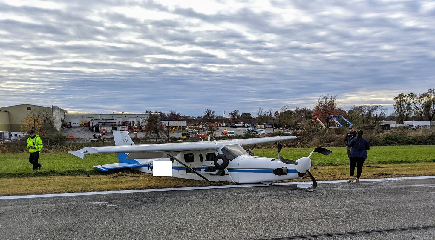 I spoke briefly with the plane’s pilot, who said that just as the plane touched down, the landing gear—its wheels—suddenly collapsed. Everything after that was beyond his control. In the photos you can see the tires as the black circles oddly pushed up to window-level of the cockpit. Investigators will look into this whole sequence. But in a case like that, no planning or practice would matter. Fate would take over.