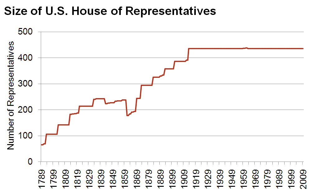 When the country was founded, there were 65 members of the House. For the next century-plus, the size of the House increased after the Census every decade, as the size of the U.S. population did. But just before World War I, the number was capped at its current level, of 435. The U.S. population is about 90 times larger than it was at the time of the Constitution. But the House is not even 7 times as large.