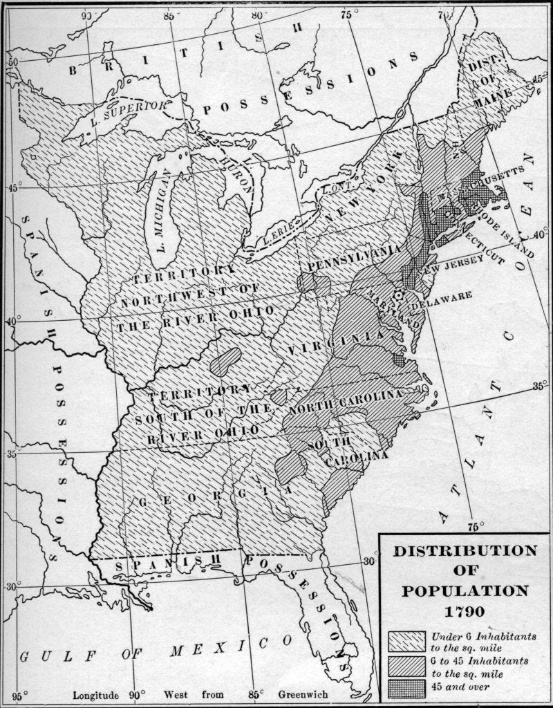 But in those days, the big states were not that much bigger than the small ones. The most populous state at the time was Virginia. The least populous was Delaware. Those biggest-and-smallest rankings apply, whether you’re counting the states’ entire population, including slaves, or just the “free whites.” And the difference between the biggest and smallest populations was about ten-to-one.
