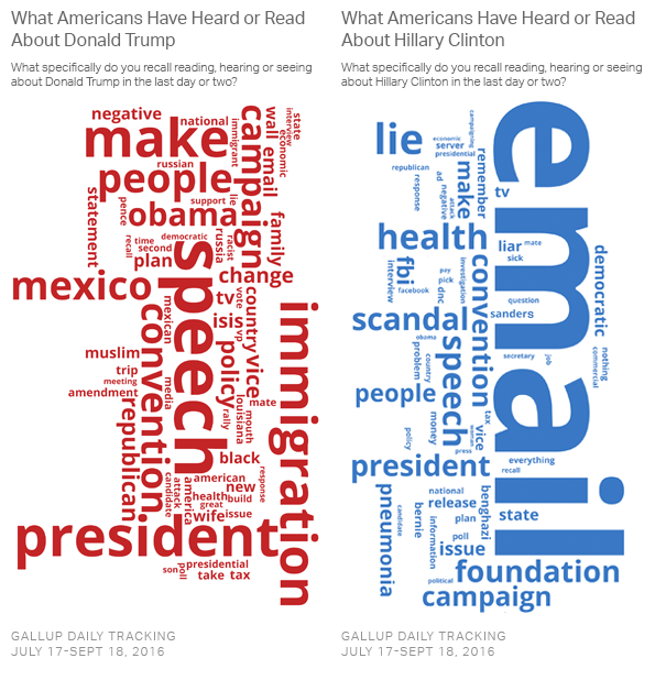 By election day, the series had reached 152 installments. Over the months its emphasis shifted away from the outlier statements and threats that Trump himself was making, mainly because there were so many of them. I began writing more about the way others were normalizing and accommodating him. Those included the “Vichy Republicans” who denounced Trump in private but in public cravenly feared to cross him. It also included parts of the press whose “false equivalence” instincts led them to bracket Trump’s historic menace with Hillary Clinton’s failings and missteps. Shortly before the election Gallup released its now-famous word-clouds dramatizing the imbalance.