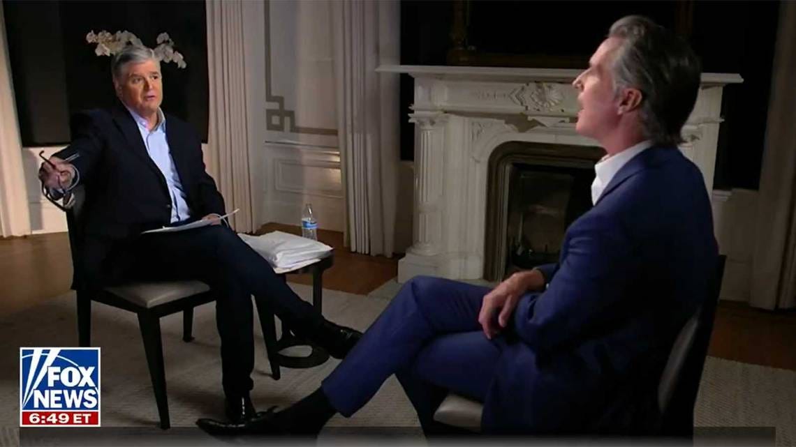 Screenshot of Sean Hannity interviewing Gavin Newsom in Sacramento, from Fox News on June 12, 2023.