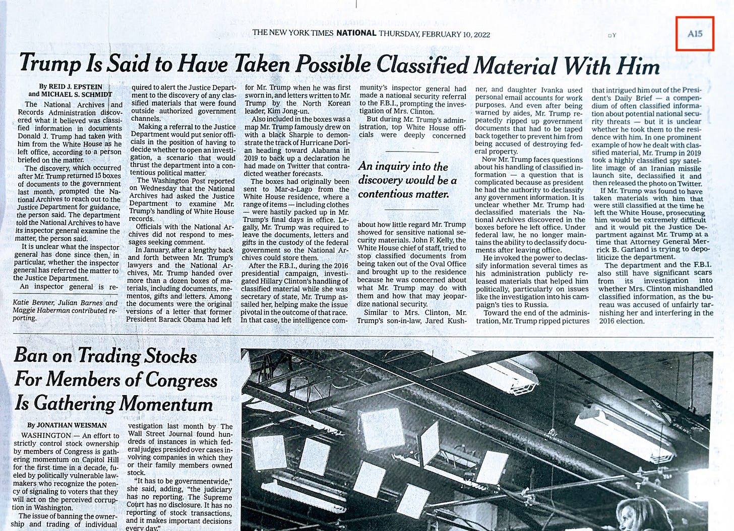 Page A15, February 10, 2022. This story reported allegations even more consequential. It was about Trump’s taking classified material among the other documents he was supposed to leave with the National Archives.