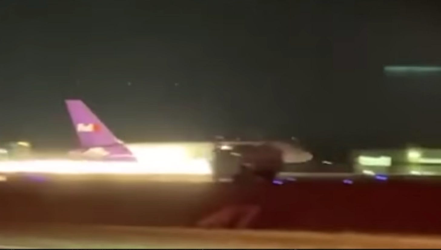 Time 17:30: The perspective on the YouTube version shifts from a moving map to actual video of the plane’s final descent. The image below is a grainy shot of the instant when the metal of the plane’s fuselage begins scraping along the runway, leaving a trail of spark and flame.