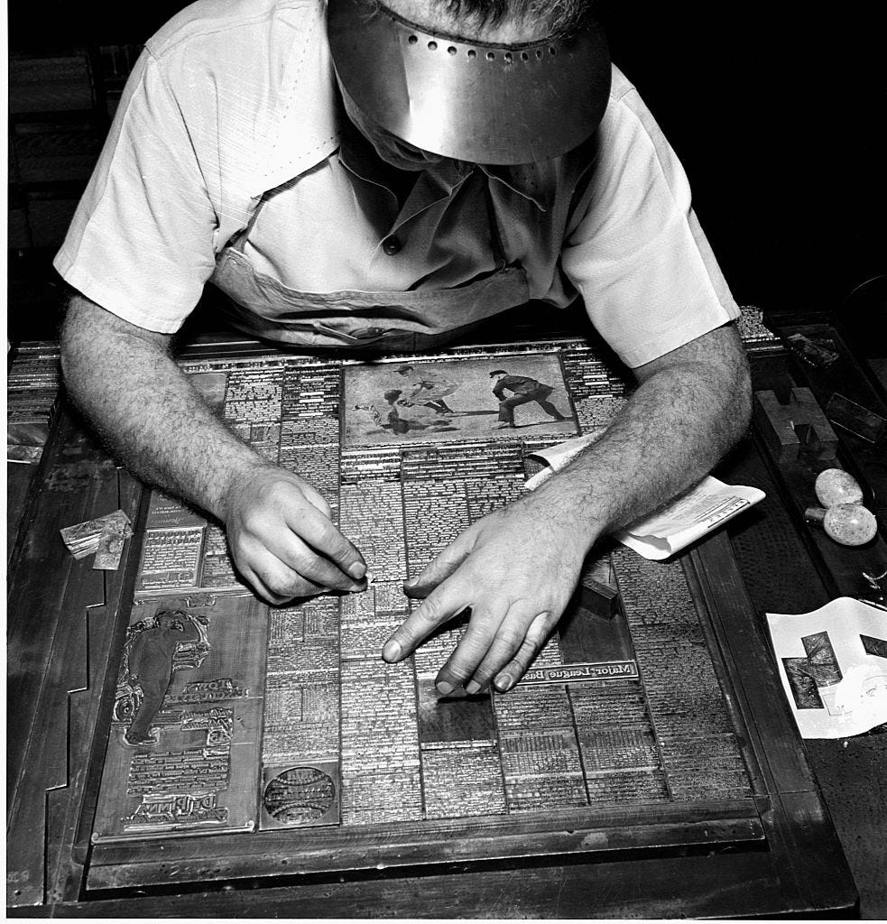 Putting a New York Times page together, back in the days of hot lead and Linotype. Everything about the media has changed, but how news organizations present their stories still matters. (Corbis / Getty Images.)