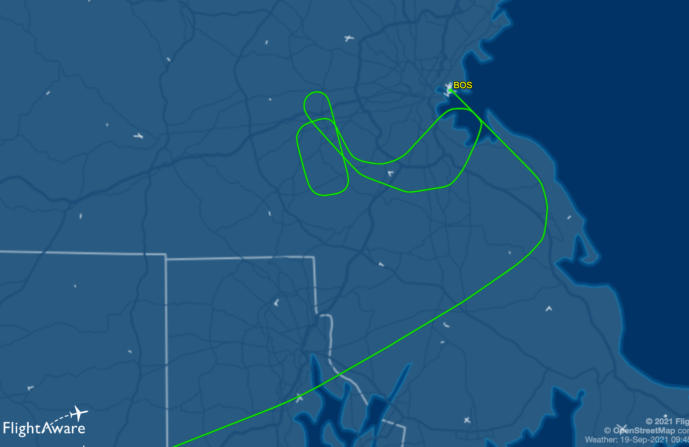 You can read more of the details here, from Boston.com. The hard landing followed an equipment malfunction, which left the pilots unsure of whether their landing gear would be “down and locked.” The screen shot above, via our friends at FlightAware, shows the delaying route the plane took while trying to diagnose the problem. I’ll explain the turns and orientation later.