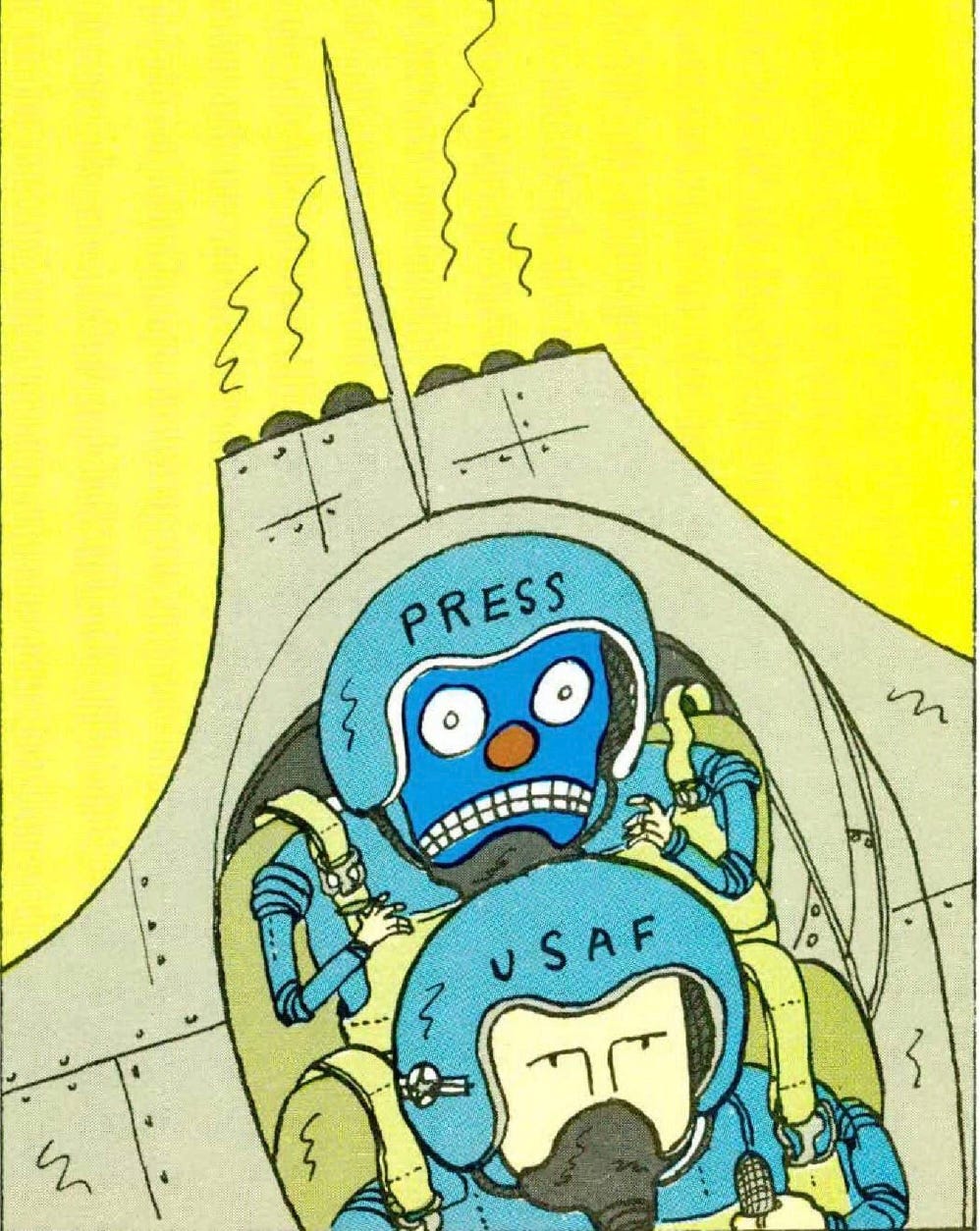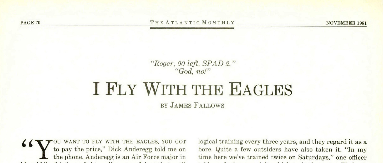 As mentioned in my post last night, for paid subscribers here is the full text of my Atlantic article about being taken for a ride in an F-15, 45 years ago. I still have the before-and-after photos from that day. Before, I’m jauntily going up the ladder to the cockpit in my fresh flight-suit. After, I’m being ladled out of the aircraft, my flight suit charmingly dappled in vomit and drenched in sweat. Fun times! But, seriously, it’s an experience I vividly remember and am very fortunate to have had.