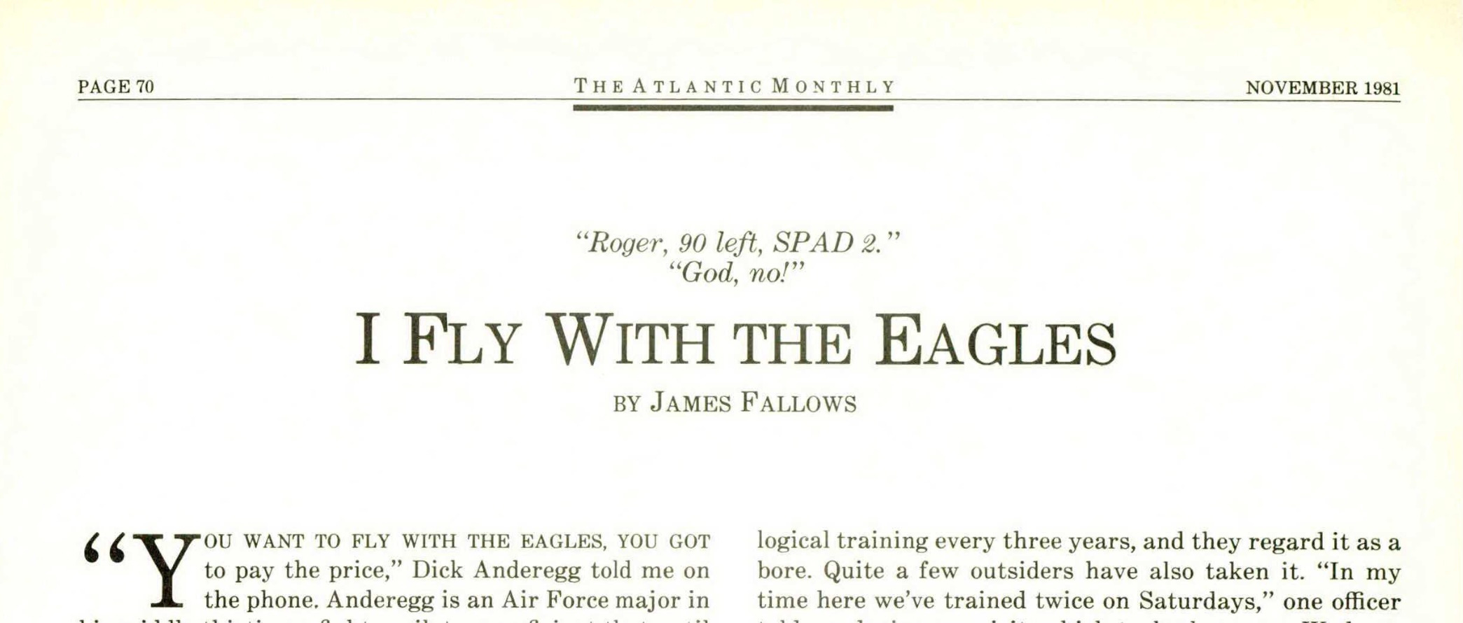 The Air Force is well-known for embracing its antagonists with hospitality and with technical displays. I had become eligible for such embrace by writing (in the May issue of The Atlantic) about the harmful consequences of the American military’s progression toward more complex, sensitive, and expensive weaponry—of which one of the most complex, sensitive, and expensive specimens is the fighter plane known as the “Eagle,” or F-15. After the article was published, the Air Force arranged several meetings with pilots and other authorities who testified about the Eagle’s capabilities. At the end of one such session, I commented that if the plane was so phenomenal, it would certainly be interesting to take a ride.