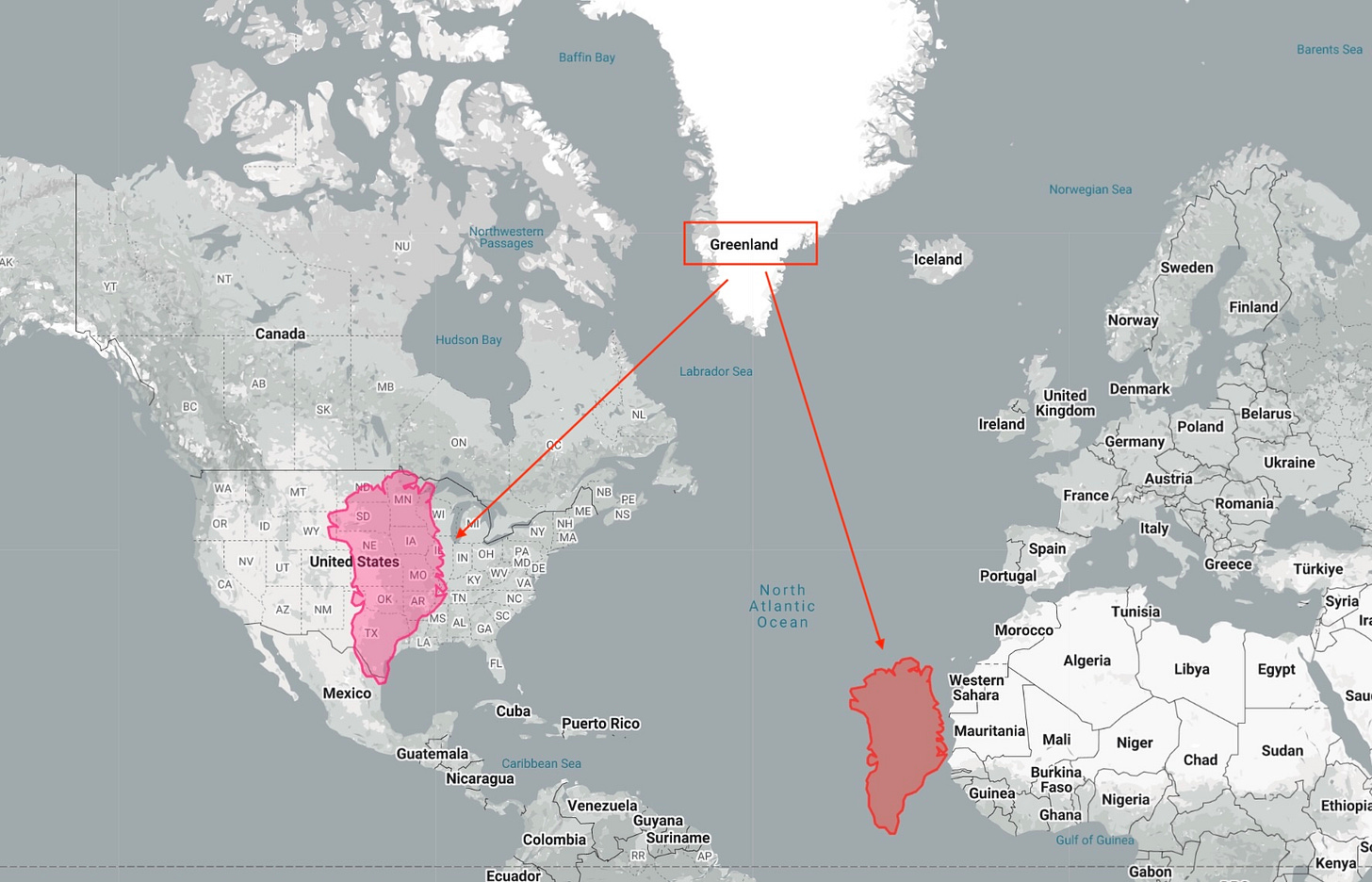This is the curse of the Mercator Projection. In grade school most Americans have seen maps on which Greenland looks enormous. It looks like a continent-scale island, as in the white area at the top of this “Mercator Projection” map.