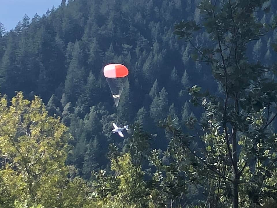 After their plane’s engine failed, over remote terrain in far northern California early this month, a young family of three descended under the plane’s parachute to a safe landing. (Photo by Kristina Carrara, via Shelter Cove Fire Department.)