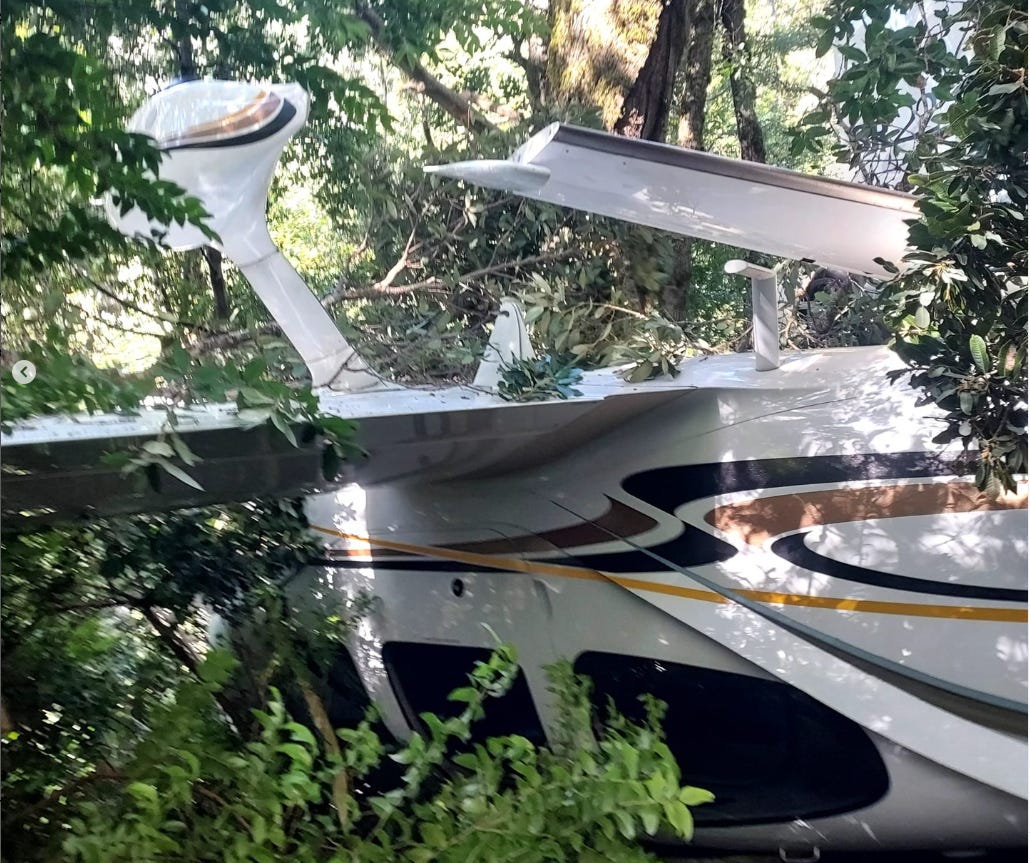 Both pilots aboard the plane walked away. The plane itself was damaged as it drifted at parachute-descent speed through branches and onto a hill. Without a parachute, the plane would have slammed at 75 mph or faster into whatever it hit.