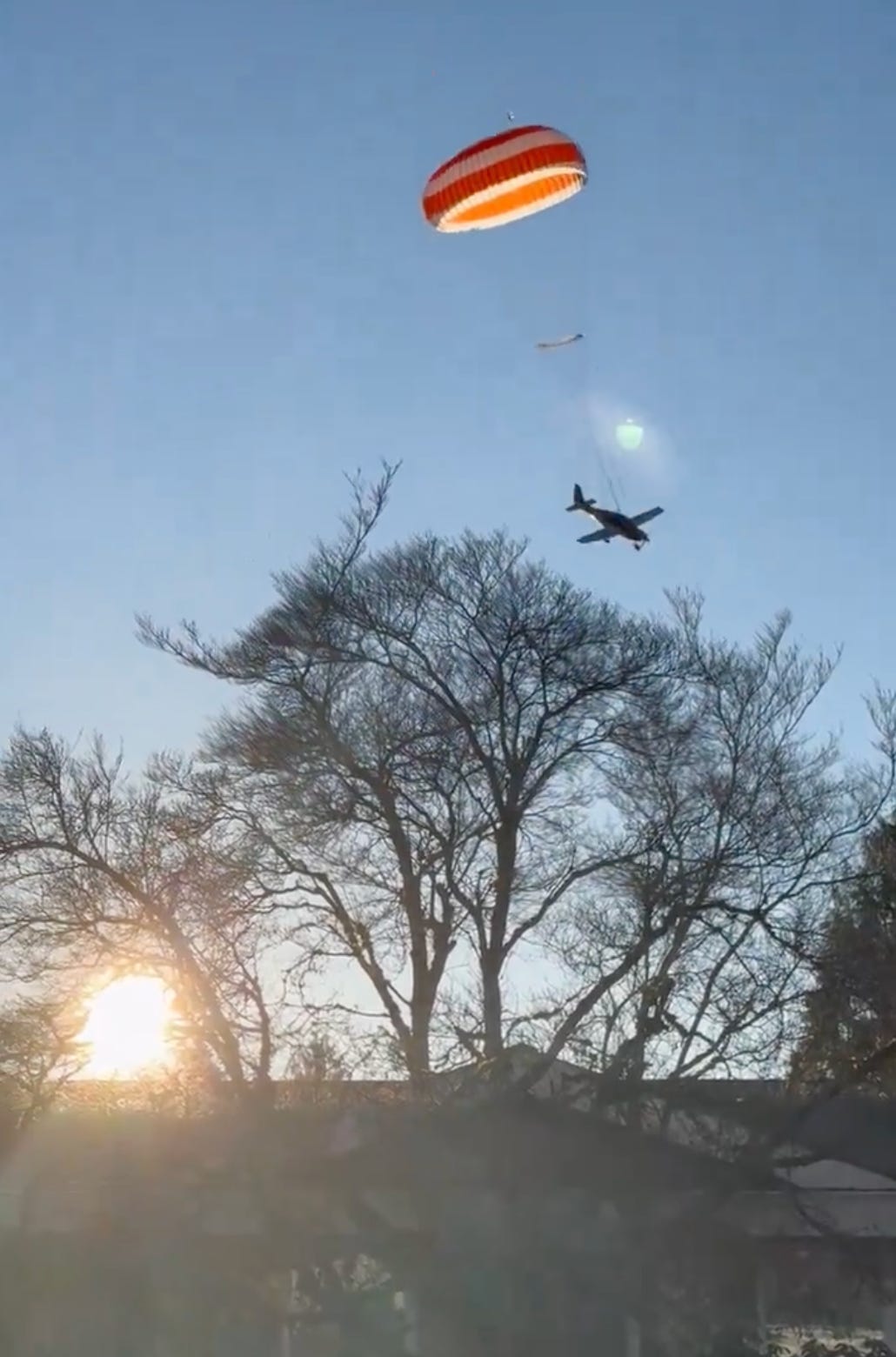 Screenshot of video from Bellevue police department showing the Cirrus floating down. That’s obviously the setting sun in the lower left. The white circle just above the airplane is from a reflection in the camera’s lens.