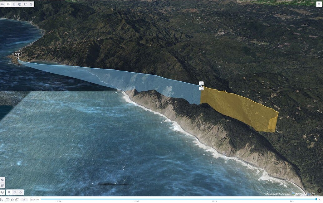 Below is a screenshot from another FlySto recreation, from Mark Waddell, showing the course of their flight. The path in blue, on the left, is their initial ascent. The white bar shows the moment of engine problems, when the plane stopped going up and started going down. The remaining, mustard-colored path shows where they began dead-sticking down, and then pulling the parachute. You can see the chilling FlySto simulation of the in-cockpit view here.