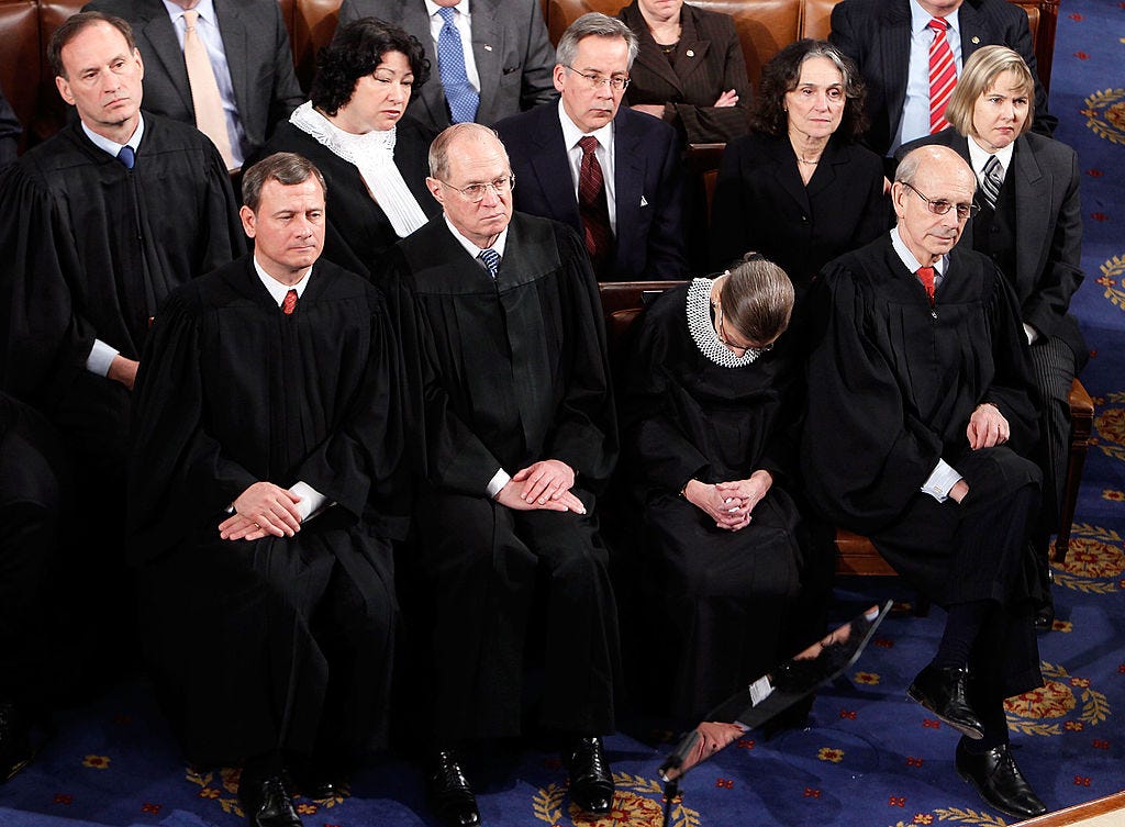 Samuel Alito, at the upper left, is not liking what he is hearing from Barack Obama, when Alito and five other Supreme Court Justices attended Obama’s 2010 SOTU. Days earlier, the Court had issued its disastrous Citizens United ruling, which Obama correctly said would “open the floodgates for special interests, including foreign corporations, to spend without limit in our elections.” While his black-robed colleagues sat poker-faced, Alito frowned, shook his head back and forth, and said loud enough for microphones to pick up, “Not true!” He has not attended any SOTU since then.