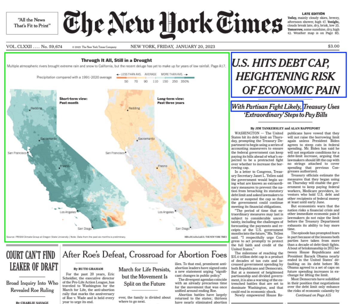 —On the one hand, this page illustrates what is (mostly) magnificent in the Times’s coverage. That’s the “map is worth a million words” depiction of how much California’s recent epic rainfall has, and has not, relieved its long-term drought. The digital-graphics and mapping teams at the Times should get their own Pulitzer every single year.