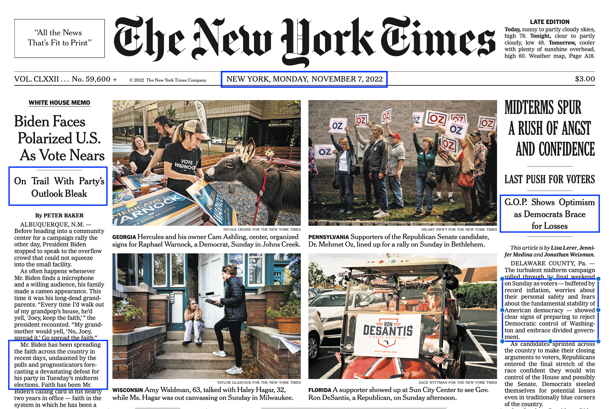 One lead story had the sub-head “Party’s Outlook Bleak,” referring to Biden and the Democrats. It mentioned forecasts of “a devastating defeat” in the midterms. The other story’s sub-head was “G.O.P Shows Optimism as Democrats Brace for Losses.” The first paragraph of that story said voters “showed clear signs of preparing to reject Democratic control.” Again, these were news, not opinion, pieces.