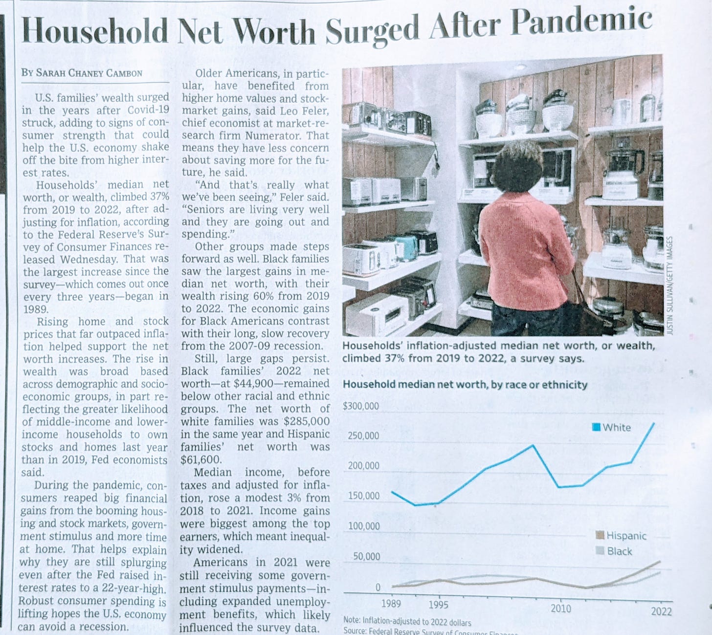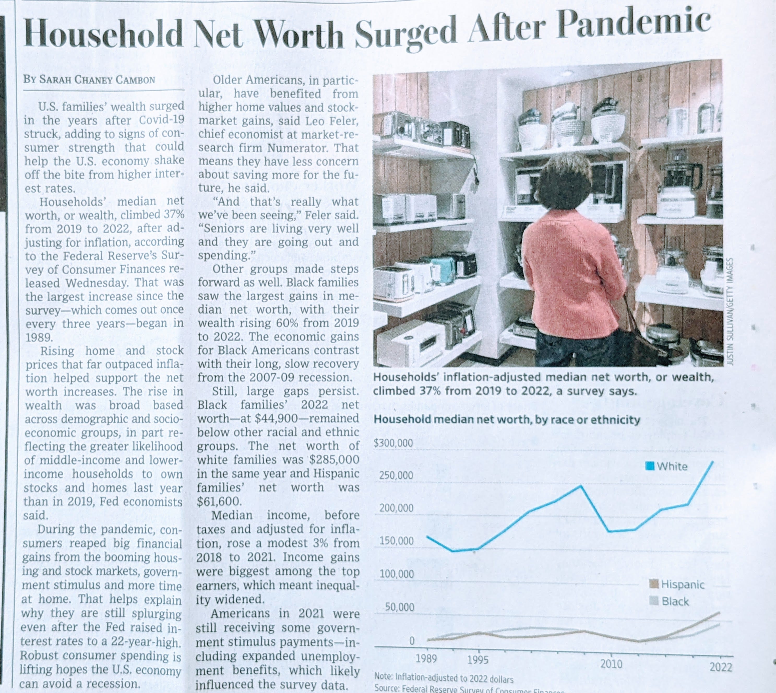 But Biden has done amazingly well under the pressures of his times—and been amazingly pooh-poohed by the press (“why doesn’t he step down?”) while doing so. Wrestling with economic fundamentals? Here is one example that stands for hundreds. The Wall Street Journal ran the headline below at the bottom of an inside page today, and the New York Times had it not in the front section but on the business pages. In short: overall household wealth is going up, and wealth-inequality is going down. Compare this understated play with the nonstop front-page coverage of rising prices for gasoline and eggs one year ago. Or imagine how the story would have been played if the findings had been the opposite—and American income gaps had continued to worsen rather than improve: