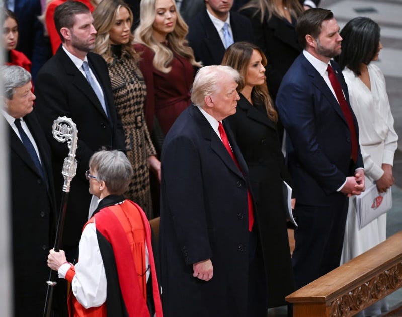 As a reminder: The time was the morning of January 21, less than 24 hours after Trump’s second swearing-in. The occasion was the National Prayer Service, which since FDR’s time has been held at the National Cathedral the day after inaugurations. Sometimes new presidents attend, sometimes not. This time, both Donald and Melania Trump were sitting in the front pew, alongside JD and Usha Vance.