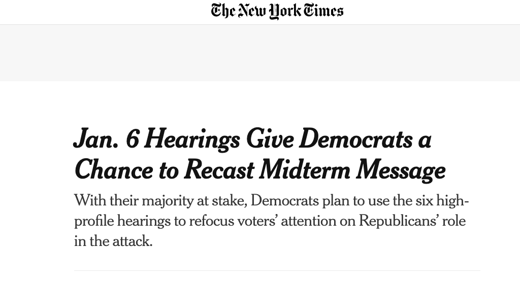 —Something that very few voters have ever wondered: What the January 6 insurrection means for the midterm message. (As opposed to: what January 6 means for American democracy and the nation’s future.)