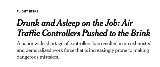 The NYT leads the front page of its Sunday paper today with an expose of strain within the air traffic control system. Here is the tabloid-style headline in its online version: