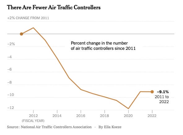 There are lots of reasons for this pattern. The lumpy cycles of hiring-and-retirement ever since Ronald Reagan’s mass firing of all air traffic controllers forty years ago. Pandemic-era retirements in high-stress jobs everywhere. Blunt-instrument cuts in “big government spending,” without awareness of real-world effects. Take your pick.