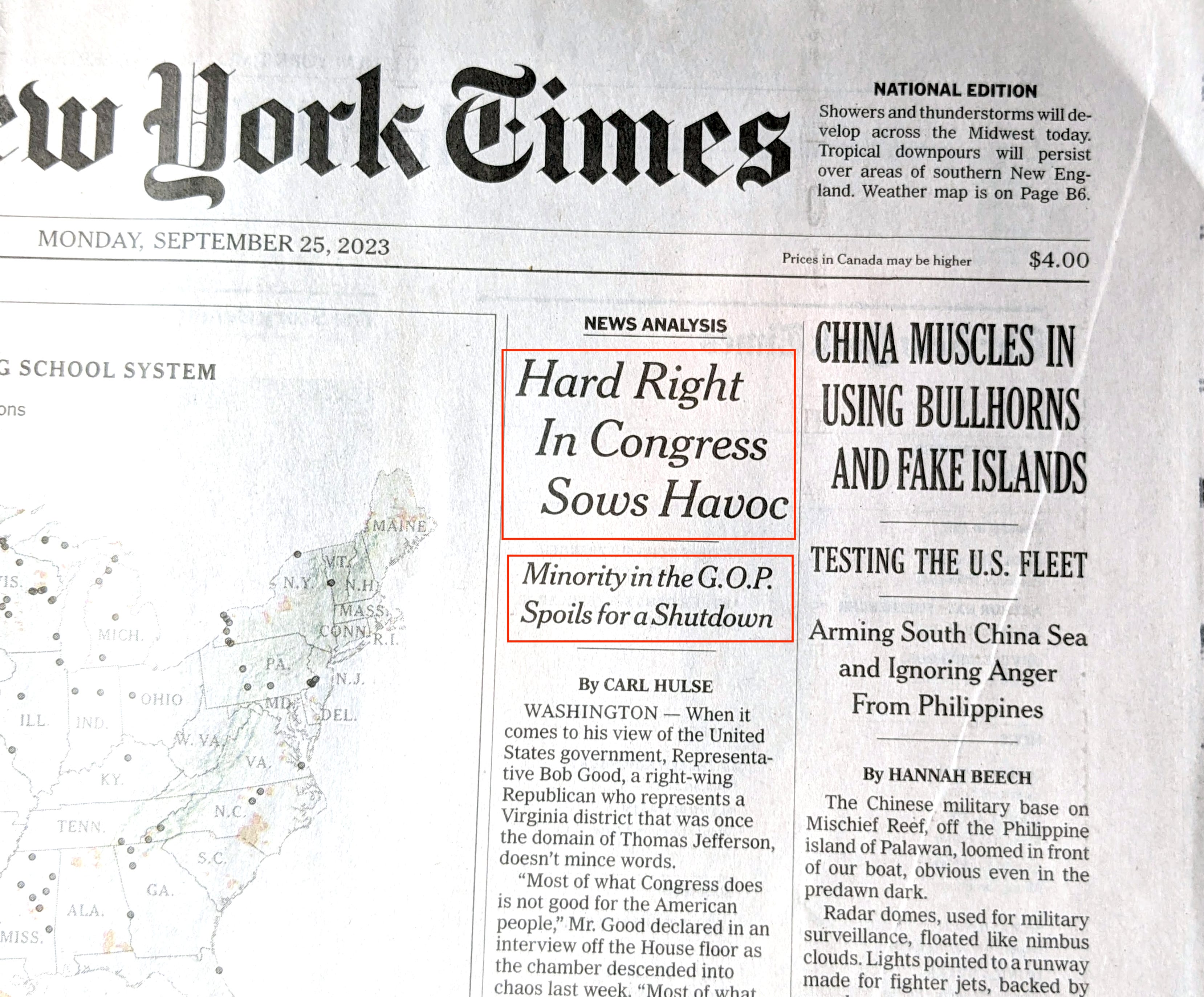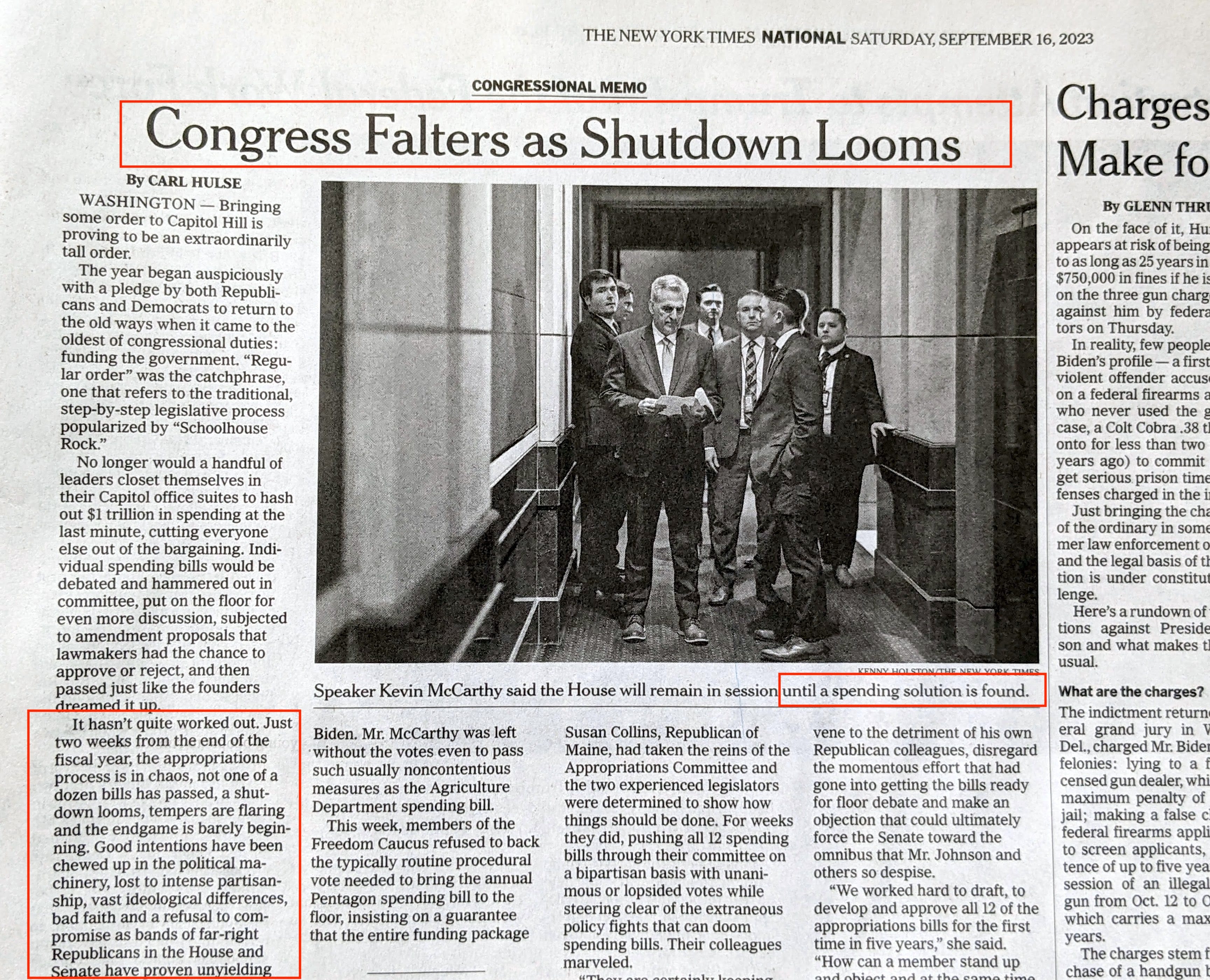 The story casts the crisis as Congress’s failure, not one party’s. An institution was “faltering,” rather than being held hostage. It’s like a report on a raging fire, lamenting that destruction will continue until “a solution is found” between arsonists and the fire department.